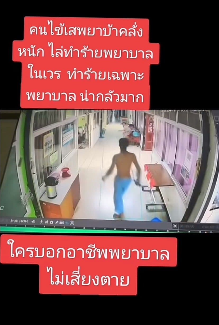กล้องวงจรปิดจับภาพ นาที พยาบาลวิ่งแตกตื่นหนีตาย หลังถูก คนไข้คลั่งยาบ้า ถือท่อนเหล็กกั้นเตียงไล่ทำร้าย โชคดีไม่มีใครได้รับบาดเจ็บ
