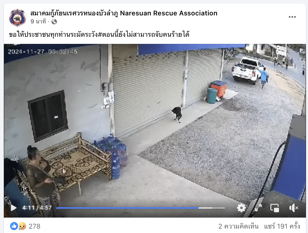 เพจเฟซบุ๊ก “สมาคมกู้ภัยนเรศวรหนองบัวลำภู Naresuan Rescue Association” รายงานสถานการณ์ล่าสุดว่า คนร้ายชื่อ สามารถ ที่พักบ้านโจด ชื่อเล่นมัง อายุประมาณ 57 ปี ขับมอเตอร์ไซค์แต่ง สีน้ำเงิน เสื้อแจ๊คเก็ตสีดำ ยังคงหลบหนี จับไม่ได้ คาดว่ามุ่งหน้าไปทางอำเภอนากลาง หรืออำเภอเมือง