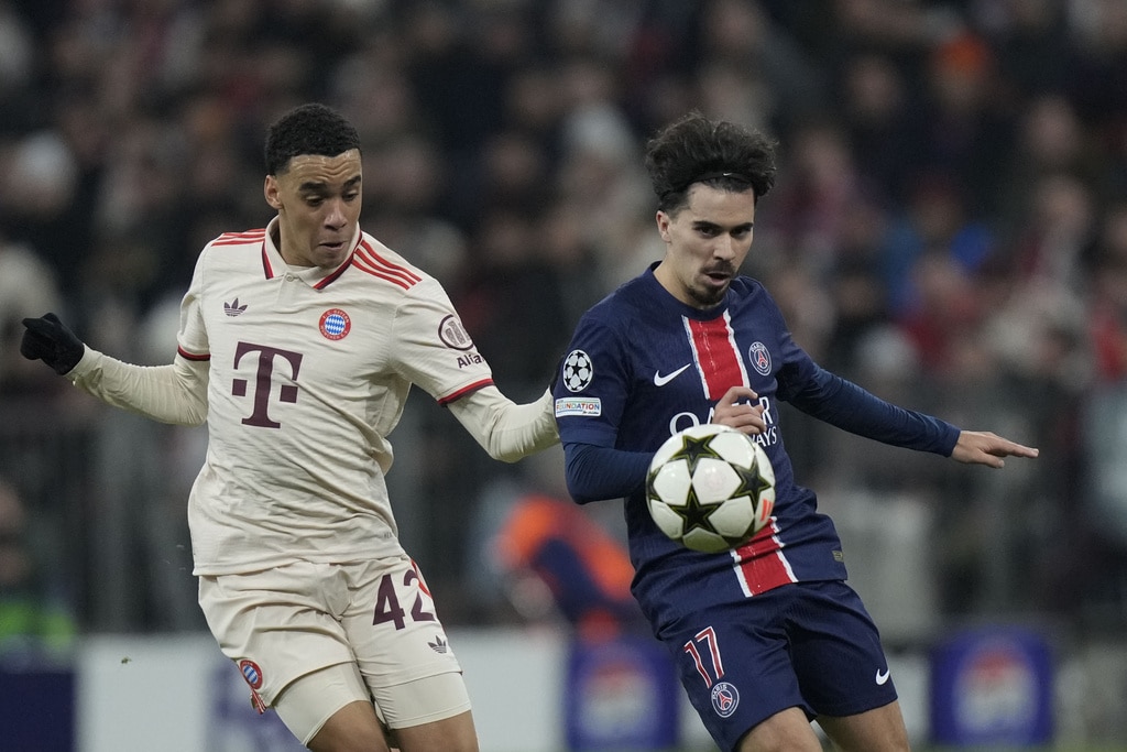 PSG’s Vitinha, right, duels for the ball with Bayern’s Jamal Musiala during the Champions League opening phase soccer match between FC Bayern and Paris Saint Germain, at the Allianz Arena in Munich, Germany, Tuesday, Nov. 26, 2024.(AP Photo/Matthias Schrader)