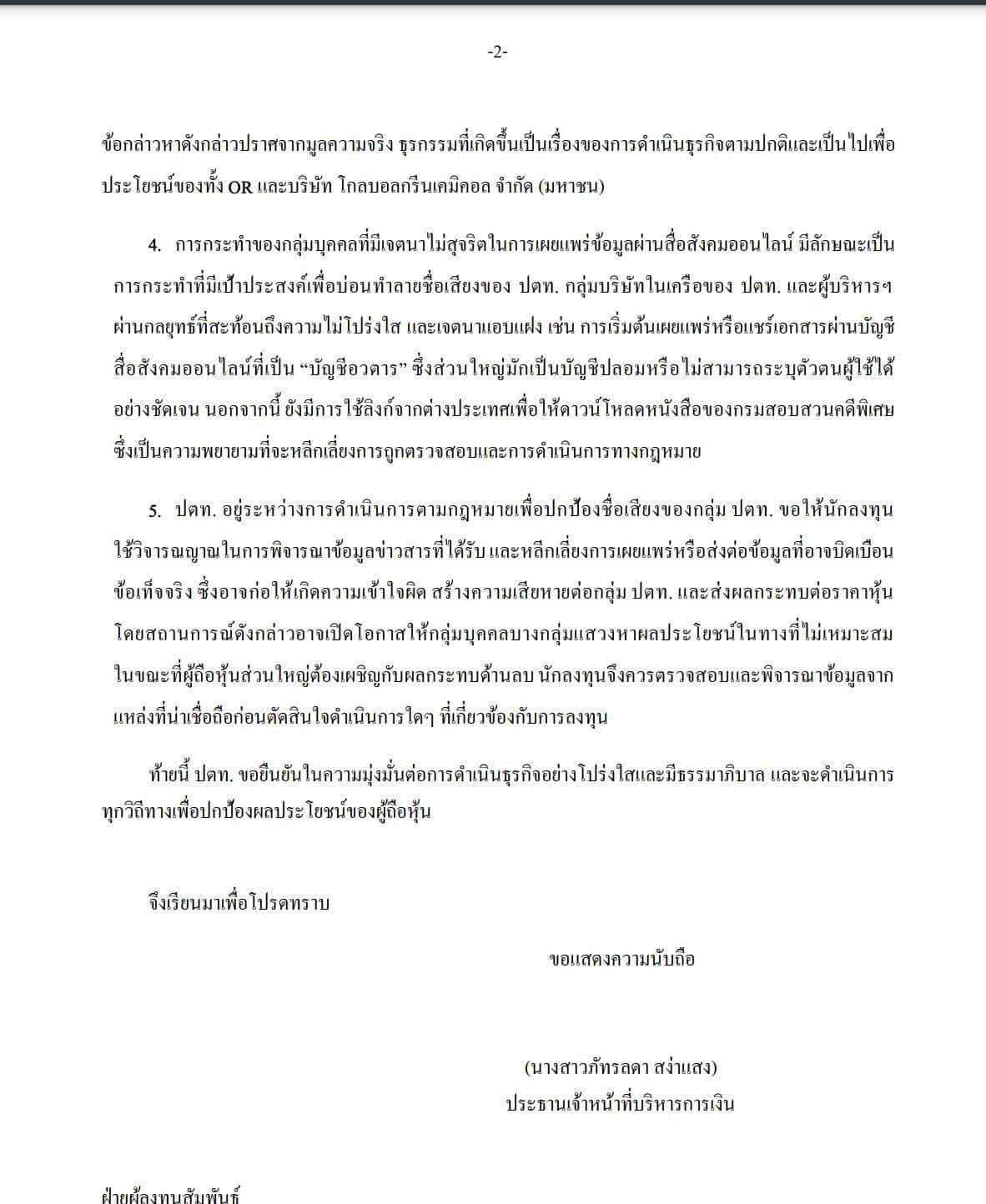 เมื่อวันที่ 28 พฤศจิกายน 2567 บริษัท ปตท. จำกัด (มหาชน) ได้ออกแถลงการณ์เพื่อชี้แจงข้อเท็จจริงกับ กรรมการและผู้จัดการ ตลาดหลักทรัพย์แห่งประเทศไทย กรณีมีข่าวลือในสื่อสังคมออนไลน์ กล่าวหาว่ามีธุรกรรมทางธุรกิจที่ไม่ชอบด้วยกฎหมายในกลุ่มบริษัทในเครือ ปตท. รวมถึงบริษัท โกลบอลกรีนเคมิคอล จำกัด (มหาชน) หรือ GGC และบริษัท ไทยออยล์ จำกัด (มหาชน) หรือ OR