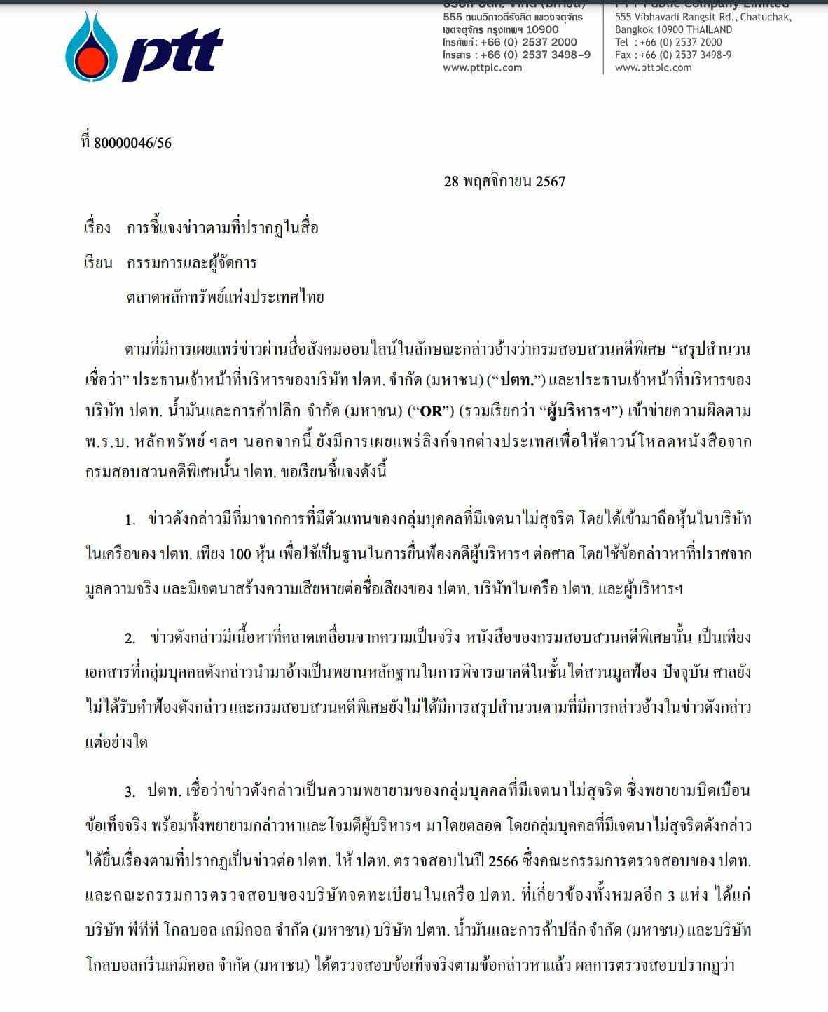แถลงการณ์ระบุว่า “ตามที่มีการเผยแพร่ข่าวผ่านสื่อสังคมออนไลน์ในลักษณะกล่าวอ้างว่าการสอบสวนคดีพิเศษ “สรุปสำนวนเชื่อว่า” ประธานเจ้าหน้าที่บริหารของบริษัท ปตท. จำกัด (มหาชน) (“ปตท.”) และประธานเจ้าหน้าที่บริหารของบริษัท ปตท. น้ำมันและการค้าปลีก จำกัด (มหาชน) (“OR”) (รวมเรียกว่า “ผู้บริหารฯ”) เข้าข่ายความผิดตาม พ.ร.บ. หลักทรัพย์ ฯลฯ นอกจากนี้ ยังมีการเผยแพร่ถึงลิงก์จากต่างประเทศเพื่อให้ดูว่าโหลดหนังสือจากกรมสอบสวนคดีพิเศษนั้น ปตท. ขอเรียนชี้แจงดังนี้