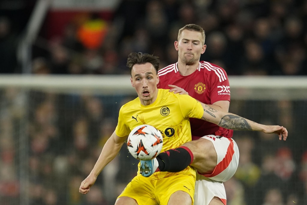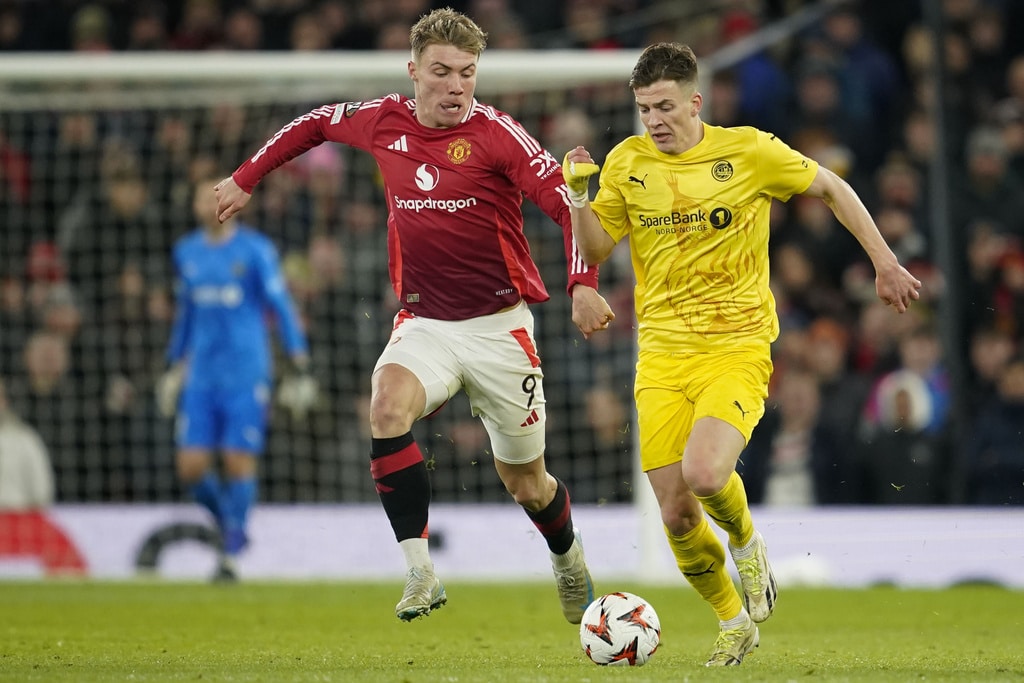 Manchester United’s Rasmus Hojlund, left, duels for the ball with Glimt’s Jostein Gundersen during the Europa League opening phase soccer match between Manchester United and Bodo Glimt, at the Old Trafford stadium in Manchester, England, Thursday, Nov. 28, 2024. (AP Photo/Dave Thompson)