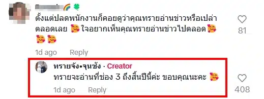 ล่าสุด ทราย เบญจมาลัญช์ ทิพย์ขันทอง ผู้ประกาศ Flash News ก็ได้ออกมาอัดคลิปตอบคำถามแฟนข่าวในช่องติ๊กต็อกของเธอ ทรายจัง•จุนซัง โดยแจ้งว่า เธอจะอ่านข่าวให้กับทางช่อง 3 ถึงสิ้นปีนี้เท่านั้น หลังจากนั้นจะโบกมือลาหน้าจอแล้วหันมาเป็น ติ๊กต็อกเกอร์ อย่างเต็มตัวแล้ว ฝากทุก ๆ คนช่วยกันซัพพอร์ตเธอในทางเดินใหม่นี้ด้วย
