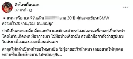 เพจดังเปิดหน้า สาวซิ่ง BMW ชน 3 แม่ลูกดับ โผล่ขอขมาศพ เพื่อนเผยนิสัย ชอบดื่มและขับประจำ