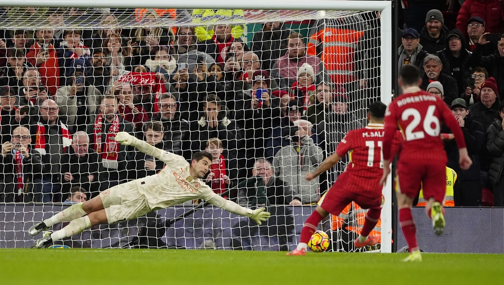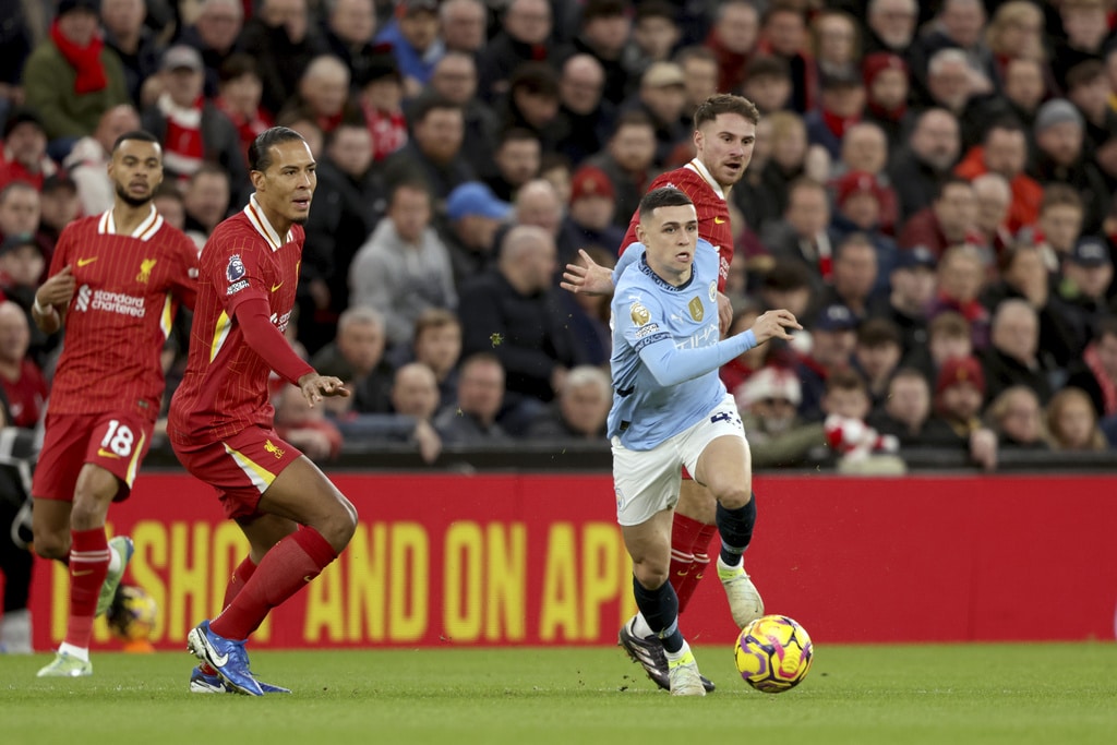 Manchester City’s Phil Foden runs away with the ball during the English Premier League soccer match between Liverpool and Manchester City at Anfield Stadium, Liverpool, England, Sunday Dec. 1, 2024. (AP Photo/Ian Hodgson)Liverpool’s Trent Alexander-Arnold vies for the ball with Manchester City’s Matheus Nunes, right, during the English Premier League soccer match between Liverpool and Manchester City at Anfield Stadium, Liverpool, England, Sunday Dec. 1, 2024. (AP Photo/Ian Hodgson)Manchester City’s Erling Haaland contols the ball during the English Premier League soccer match between Liverpool and Manchester City at Anfield Stadium, Liverpool, England, Sunday Dec. 1, 2024. (Peter Byrne/PA via AP)Liverpool’s Virgil van Dijk, 2nd left, jumps to head the ball during the English Premier League soccer match between Liverpool and Manchester City at Anfield Stadium, Liverpool, England, Sunday Dec. 1, 2024. (AP Photo/Ian Hodgson)Liverpool’s Cody Gakpo, center, celebrates scoring their side’s first goal of the gameduring the English Premier League soccer match between Liverpool and Manchester City at Anfield Stadium, Liverpool, England, Sunday Dec. 1, 2024. (Peter Byrne/PA via AP)Liverpool’s Mohamed Salah scores from the penalty spot past Manchester City goalkeeper Stefan Ortega during an English Premier League soccer match at Anfield Stadium, Liverpool, England, Sunday Dec. 1, 2024. (Peter Byrne/PA via AP)Manchester City’s head coach Pep Guardiola puts up six fingers to remind the jeering fans of his six Premier League titles at the end of the English Premier League soccer match between Liverpool and Manchester City at Anfield Stadium, Liverpool, England, Sunday Dec. 1, 2024. (AP Photo/Ian Hodgson)Manchester City’s head coach Pep Guardiola applauds the fans at the end of the English Premier League soccer match between Liverpool and Manchester City at Anfield Stadium, Liverpool, England, Sunday Dec. 1, 2024. (AP Photo/Ian Hodgson)