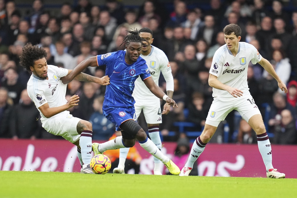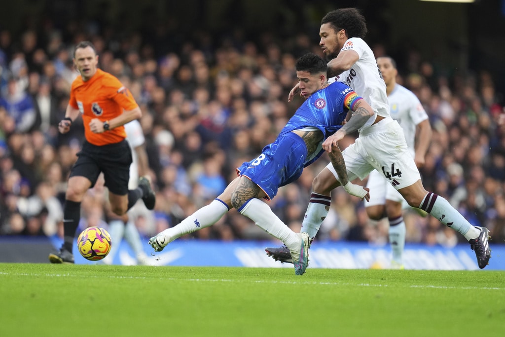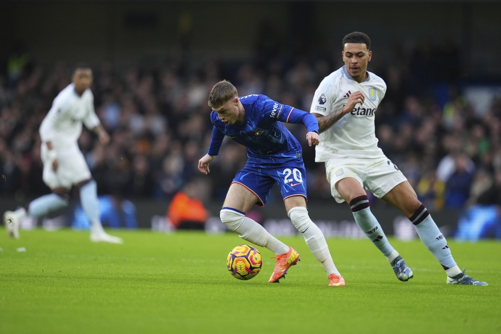 Chelsea’s Romeo Lavia, centre, challenges for the ball with Aston Villa’s Pau Torres, right, and Boubacar Kamara, left, during the English Premier League soccer match between Chelsea and Aston Villa at the Stamford Bridge stadium in London, Sunday, Dec. 1, 2024. (AP Photo/Kirsty Wigglesworth)Chelsea’s Cole Palmer, centre, and Aston Villa’s Morgan Rogers challenge for the ball during the English Premier League soccer match between Chelsea and Aston Villa at the Stamford Bridge stadium in London, Sunday, Dec. 1, 2024. (AP Photo/Kirsty Wigglesworth)Chelsea’s Wesley Fofana, left, and Aston Villa’s Ollie Watkins challenge for the ball during the English Premier League soccer match between Chelsea and Aston Villa at the Stamford Bridge stadium in London, Sunday, Dec. 1, 2024. (AP Photo/Kirsty Wigglesworth)Chelsea’s Enzo Fernandez celebrates after scoring his side’s second goal during the English Premier League soccer match between Chelsea and Aston Villa at the Stamford Bridge stadium in London, Sunday, Dec. 1, 2024. (AP Photo/Kirsty Wigglesworth)Chelsea’s Pedro Neto, left, and Aston Villa’s Youri Tielemans challenge for the ball during the English Premier League soccer match between Chelsea and Aston Villa at the Stamford Bridge stadium in London, Sunday, Dec. 1, 2024. (AP Photo/Kirsty Wigglesworth)Chelsea’s Enzo Fernandez, centre, and Aston Villa’s Boubacar Kamara challenge for the ball during the English Premier League soccer match between Chelsea and Aston Villa at the Stamford Bridge stadium in London, Sunday, Dec. 1, 2024. (AP Photo/Kirsty Wigglesworth)Chelsea’s Cole Palmer, right, celebrates after scoring his side’s third goal during the English Premier League soccer match between Chelsea and Aston Villa at the Stamford Bridge stadium in London, Sunday, Dec. 1, 2024. (AP Photo/Kirsty Wigglesworth)