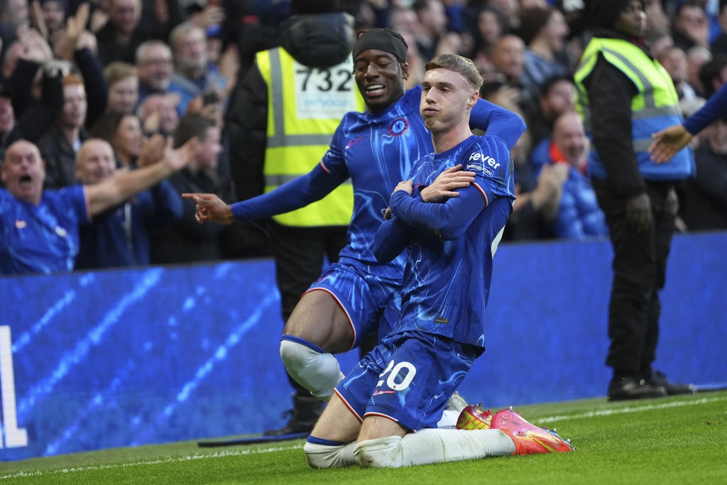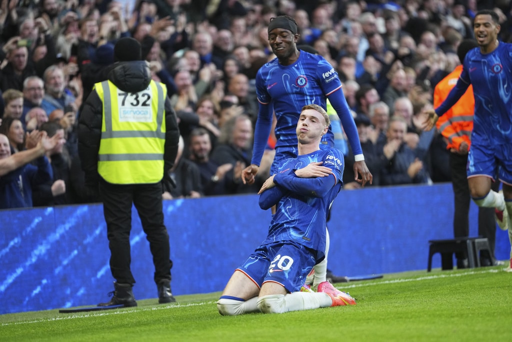 Chelsea’s Cole Palmer celebrates after scoring his side’s third goal during the English Premier League soccer match between Chelsea and Aston Villa at the Stamford Bridge stadium in London, Sunday, Dec. 1, 2024. (AP Photo/Kirsty Wigglesworth)