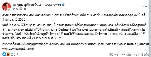วันที่ 2 ธันวาคม 2567 เพจ สรยุทธ สุทัศนะจินดา กรรมกรข่าว แจ้งข่าวจาก กรมราชทัณฑ์ ว่ามีการปล่อยตัวพักโทษ นายบุญทรง อดีต รมว.พาณิชย์ สมัยรัฐบาลน.ส.ยิ่งลักษณ์ หลังถูกศาลพิพากษาจำคุก 42 ปี คดีจำนำข้าว ปี 2558 แต่ยังต้องอยู่ในความควบคุมของกรมคุมประพฤติ