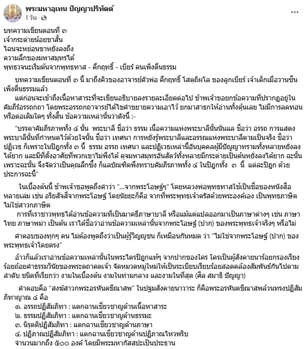 เป็นอีกหนึ่งประเด็นที่มีคนให้ความสนใจอย่างมาก เมื่อ พระมหาอุเทน ปัญญาปริทัตต์ พระนักเทศน์-นักเขียน วัดชนะสงครามวรมหาวิหาร ได้โพสต์ข้อความถึง อ.เบียร์ คนตื่นธรรม ลั่น “เบียร์ เจ้าเด็กเมื่อวานซืน เพิ่งตื่นธรรม” พร้อมด้วยแนบหลักคำสอนต่าง ๆ เอาไว้ โดยมีทั้งหมด 4 โพสต์ยาว ๆ ด้วยกัน