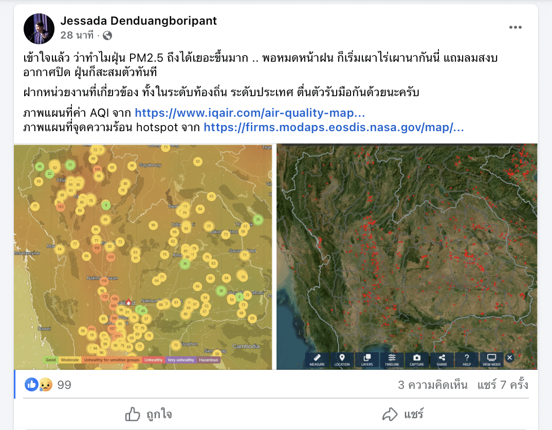 อาจารย์เจษฎ์ โพสต์ภาพแผนที่แสดงค่า AQI (Air Quality Index) หรือดัชนีคุณภาพอากาศ และแผนที่จุดความร้อน (Hotspot) จากเว็บไซต์ iqair.com และ firms.modaps.eosdis.nasa.gov ตามลำดับ โดยระบุว่า “เข้าใจแล้ว ว่าทำไมฝุ่น PM2.5 ถึงได้เยอะขึ้นมาก .. พอหมดหน้าฝน ก็เริ่มเผาไร่เผานากันนี่ แถมลมสงบ อากาศปิด ฝุ่นก็สะสมตัวทันที”