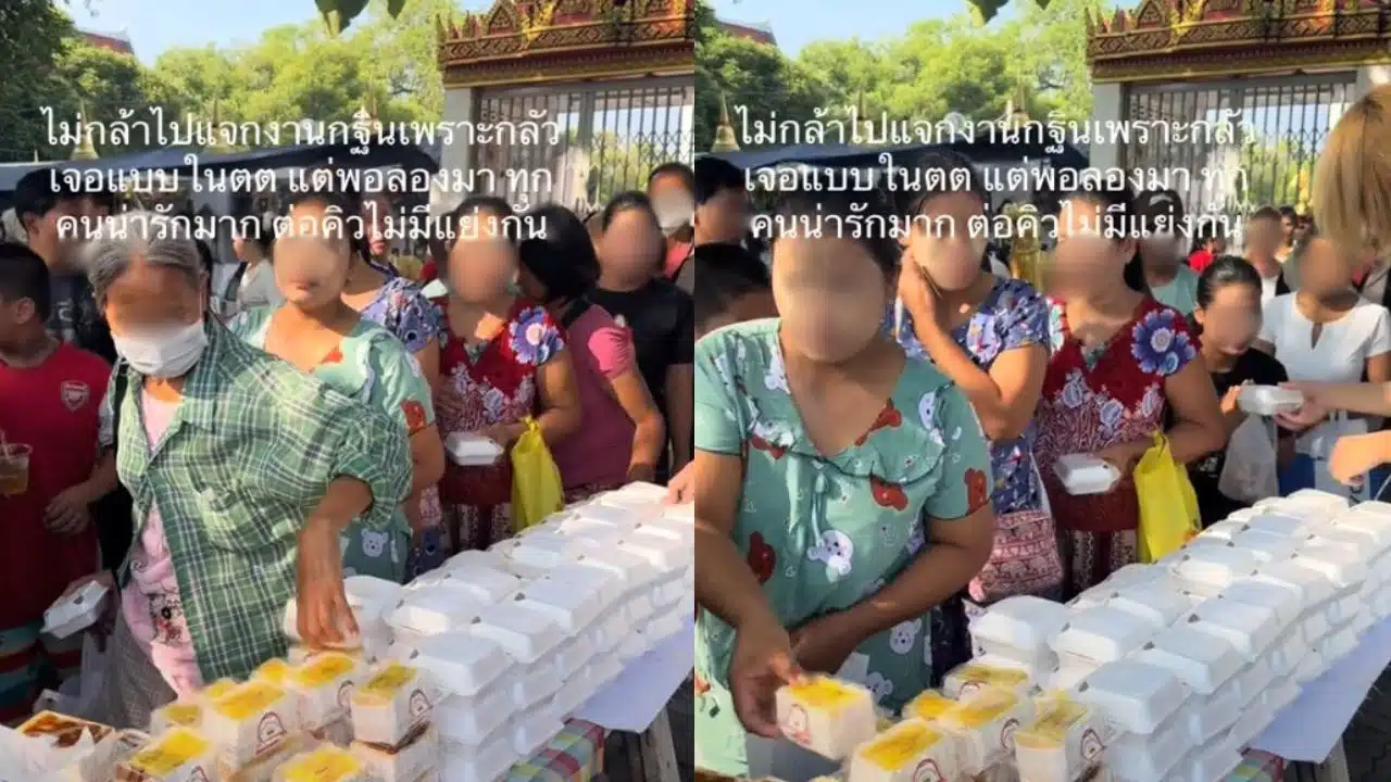 สาวรับหน้าที่เป็นเจ้าภาพแจกอาหารที่งานกฐิน รับตอนแรกกลัวไม่กล้ามา แต่เจอของจริง บอกเลยว่าไม่เหมือนกับที่เคยเห็นในออนไลน์ จนกลายเป็นไวรัล
