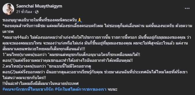 ดราม่า แสนชัย มวยไทยยิม โพสต์ตอบโต้แฟนมวยสุดเดือด หลังถูกแซะ ได้ต่อยแต่กับคู่แข่งที่ไม่เก่ง เหมือนไปต่อยกับเด็กอนุบาล