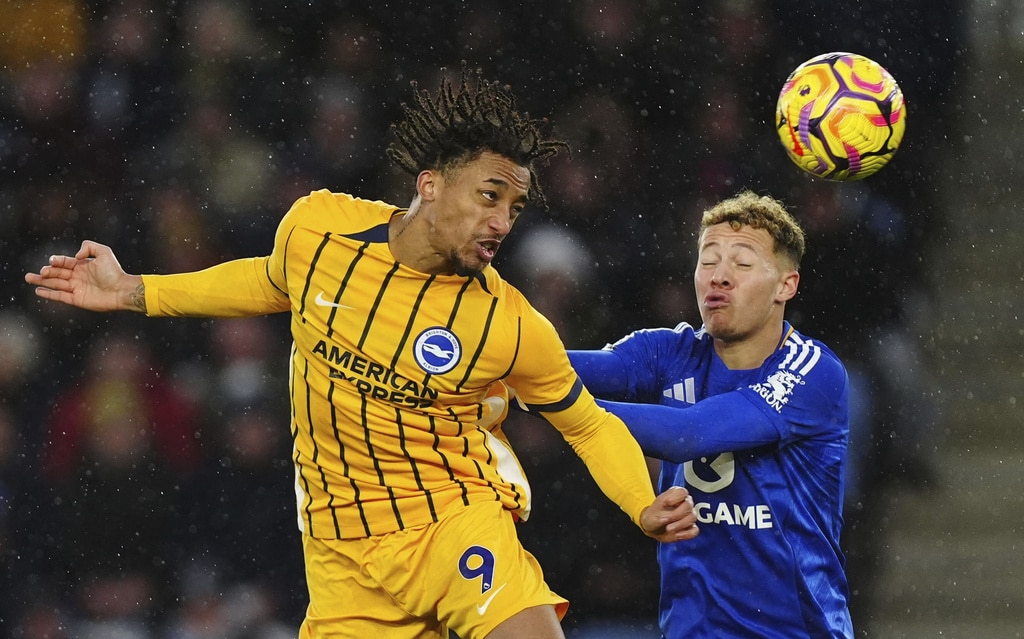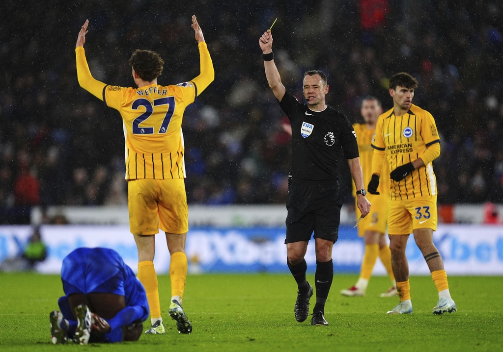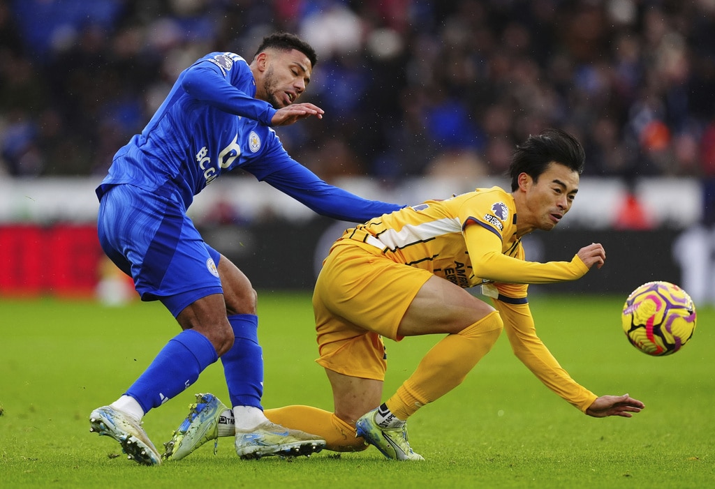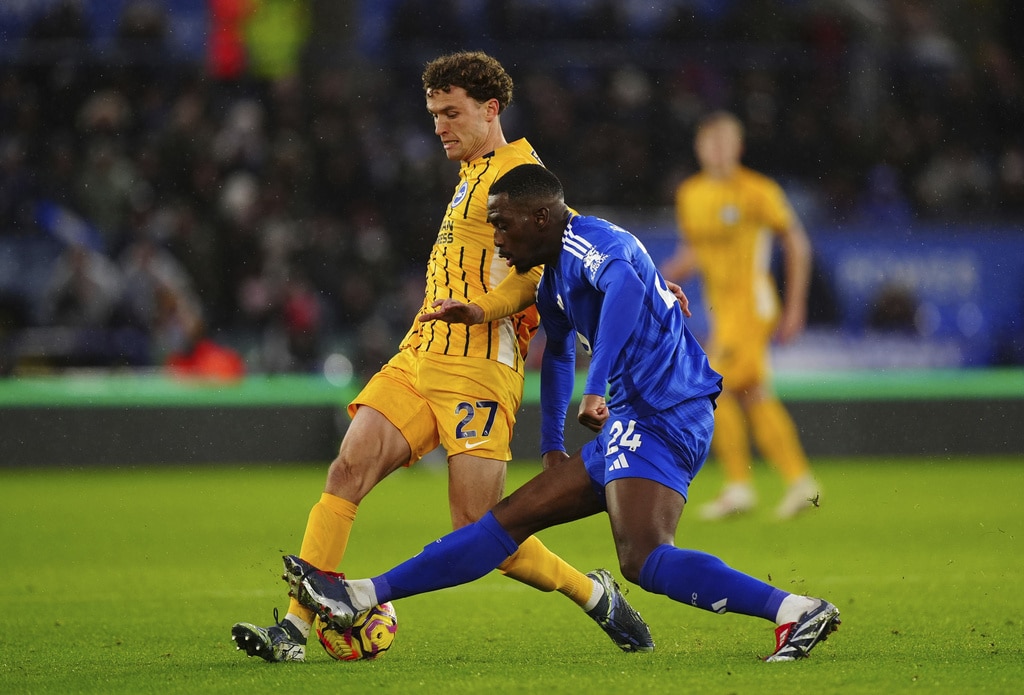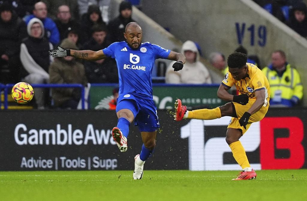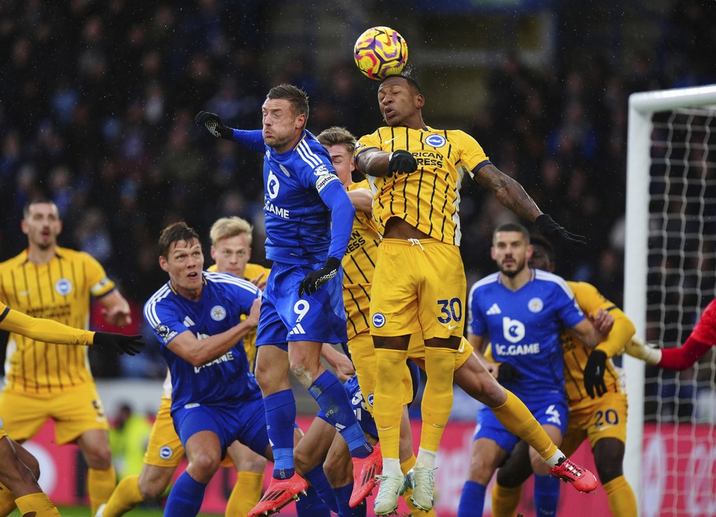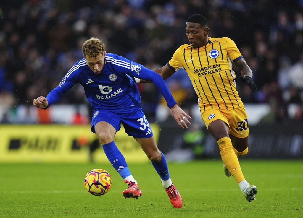 Leicester City’s James Justin, left and Brighton’s Kaoru Mitoma vie for the ball, during the English Premier League soccer match between Leicester City and Brighton and Hove Albion, at the King Power Stadium, in Leicester, England, Sunday, Dec. 8, 2024. (Mike Egerton/PA via AP)Brighton and Hove Albion’s Mats Wieffer is shown a yellow card by referee Stuart Attwell, during the English Premier League soccer match between Leicester City and Brighton and Hove Albion, at the King Power Stadium, in Leicester, England, Sunday, Dec. 8, 2024. (Mike Egerton/PA via AP)Brighton and Hove Albion’s Joao Pedro, left and Leicester City’s Kasey McAteer vie for the ball, during the English Premier League soccer match between Leicester City and Brighton and Hove Albion, at the King Power Stadium, in Leicester, England, Sunday, Dec. 8, 2024. (Mike Egerton/PA via AP)Brighton and Hove Albion’s Mats Wieffer, left and Leicester City’s Boubakary Soumare vie for the ball, during the English Premier League soccer match between Leicester City and Brighton and Hove Albion, at the King Power Stadium, in Leicester, England, Sunday, Dec. 8, 2024. (Mike Egerton/PA via AP)Brighton and Hove Albion’s Tariq Lamptey scores his side’s first goal of the game, during the English Premier League soccer match between Leicester City and Brighton and Hove Albion, at the King Power Stadium, in Leicester, England, Sunday, Dec. 8, 2024. (Mike Egerton/PA via AP)Leicester City’s Kasey McAteer, left and Brighton and Hove Albion’s Pervis Estupinan vie for the ball, during the English Premier League soccer match between Leicester City and Brighton and Hove Albion, at the King Power Stadium, in Leicester, England, Sunday, Dec. 8, 2024. (Mike Egerton/PA via AP)Leicester City’s Jamie Vardy, center left and Brighton’s Pervis Estupinan vie for the ball, during the English Premier League soccer match between Leicester City and Brighton and Hove Albion, at the King Power Stadium, in Leicester, England, Sunday, Dec. 8, 2024. (Mike Egerton/PA via AP)