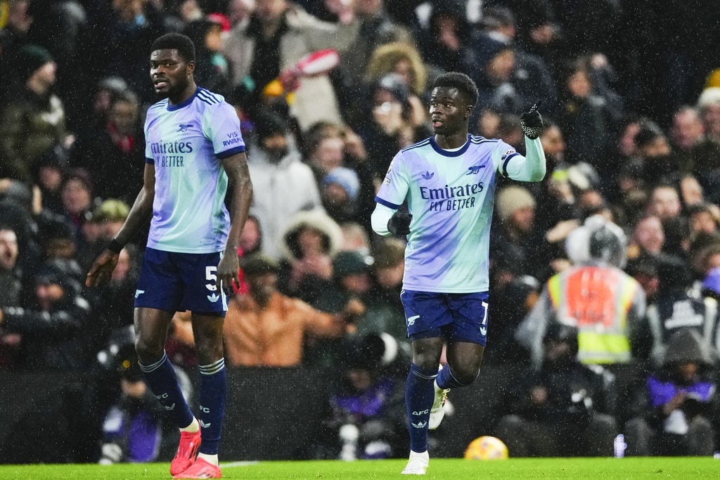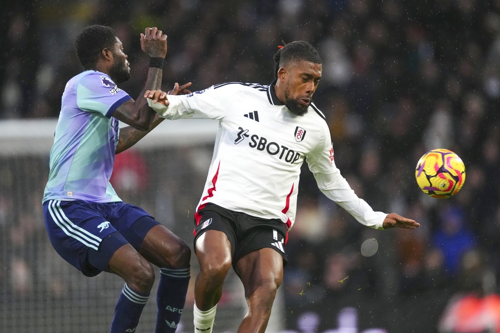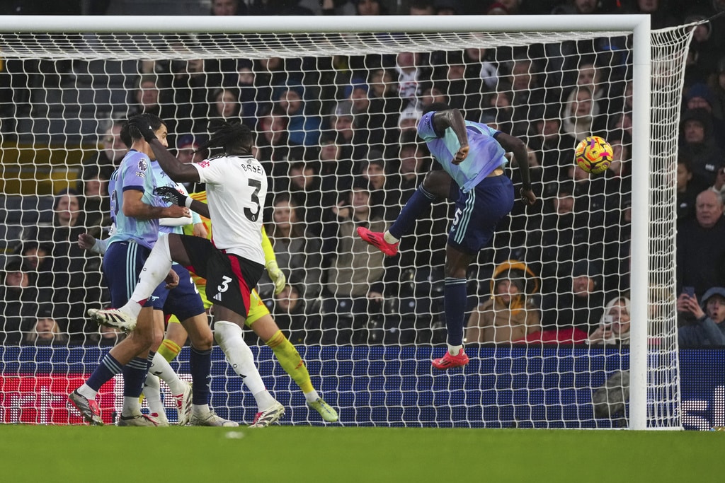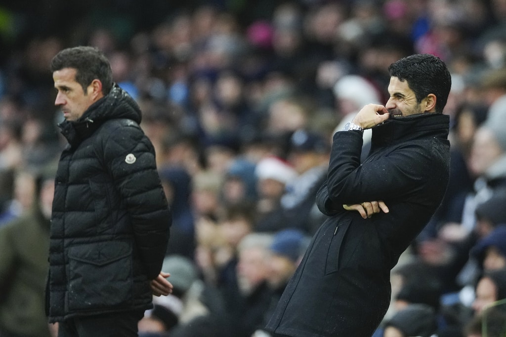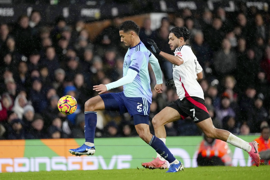 Arsenal’s Kai Havertz, centre, in action during the English Premier League soccer match between Fulham and Arsenal, at the Craven Cottage Stadium in London, Sunday, Dec. 8, 2024. (AP Photo/Dave Shopland)Arsenal’s Bukayo Saka, right, and Arsenal’s Thomas Partey during the English Premier League soccer match between Fulham and Arsenal, at the Craven Cottage Stadium in London, Sunday, Dec. 8, 2024. (AP Photo/Dave Shopland)Fulham’s head coach Marco Silva, left, talks to Fulham’s Rodrigo Muniz during the English Premier League soccer match between Fulham and Arsenal, at the Craven Cottage Stadium in London, Sunday, Dec. 8, 2024. (AP Photo/Dave Shopland)Fulham’s Raul Jimenez, right, challenges for the ball with Arsenal’s William Saliba during the English Premier League soccer match between Fulham and Arsenal, at the Craven Cottage Stadium in London, Sunday, Dec. 8, 2024. (AP Photo/Dave Shopland)Arsenal’s Thomas Partey, right, makes an attempt to score during the English Premier League soccer match between Fulham and Arsenal, at the Craven Cottage Stadium in London, Sunday, Dec. 8, 2024. (AP Photo/Dave Shopland)Arsenal’s Thomas Partey, left, challenges for the ball with Fulham’s Alex Iwobi during the English Premier League soccer match between Fulham and Arsenal, at the Craven Cottage Stadium in London, Sunday, Dec. 8, 2024. (AP Photo/Dave Shopland)Arsenal’s manager Mikel Arteta, right, and Fulham’s head coach Marco Silva react during the English Premier League soccer match between Fulham and Arsenal, at the Craven Cottage Stadium in London, Sunday, Dec. 8, 2024. (AP Photo/Dave Shopland)