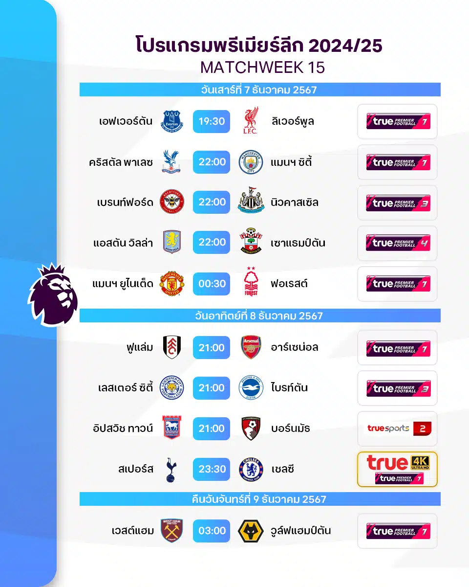 โปรแกรมพรีเมียร์ลีก 2024/25 สัปดาห์ที่ 15 แข่งวันที่ 7-9 ธ.ค. นี้ ตารางแข่งพร้อมช่องดูบอลสด