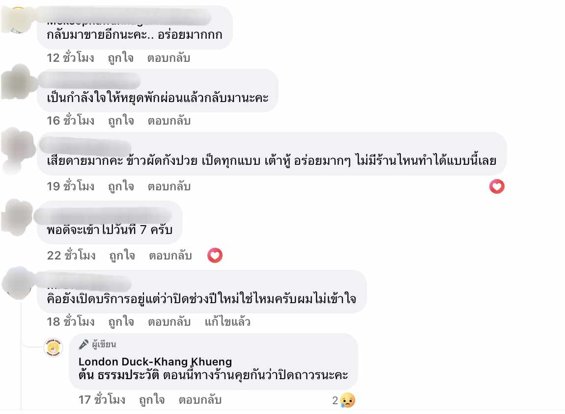 ในโพสต์ดังกล่าว ได้มีแฟนๆ เข้ามาให้กำลังใจจำนวนมาก พร้อมหวังว่า จะมีโอกาสกลับมาเปิดใหม่อีกครั้ง เพราะอาหารคุณภาพดี รสชาติอร่อย ราคาเหมาะสม