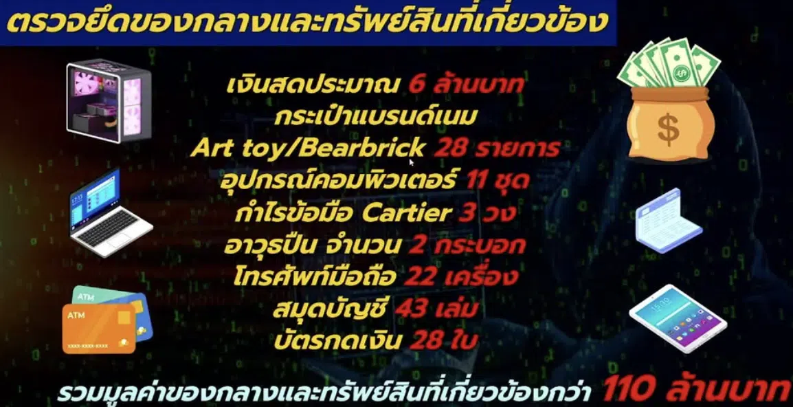 ตำรวจสืบสวนจนเจอตัวผู้ร่วมขบวนการทั้งหมด 11 คน ทั้งเจ้าของเว็บไซต์ คนดูแลเงิน พนักงาน และบัญชีม้า ก่อนบุกค้น 5 จุด ในกรุงเทพฯ และปริมณฑล รวบตัวผู้ต้องหาได้ 5 คน พร้อมยึดทรัพย์สินมูลค่ามหาศาลกว่า 110 ล้านบาท! มีทั้งรถหรู นาฬิกาแบรนด์ดัง เงินสด และของแบรนด์เนมเพียบ ประกอบด้วย