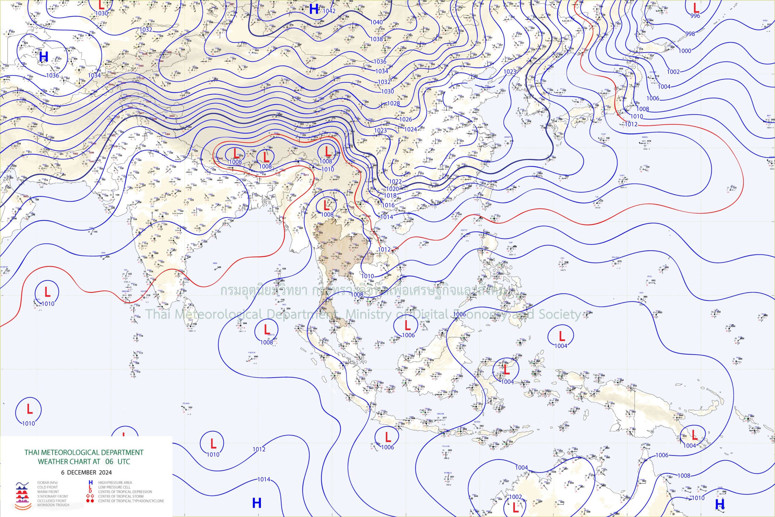 อนึ่ง ในช่วงวันที่ 8–10 ธ.ค. 67 บริเวณความกดอากาศสูงหรือมวลอากาศเย็นกำลังปานกลางระลอกใหม่จากประเทศจีนจะแผ่ลงมาปกคลุมประเทศไทยตอนบนและทะเลจีนใต้ ลักษณะเช่นนี้ทำให้บริเวณดังกล่าวจะมีอุณหภูมิลดลงกับมีลมแรง โดยอุณหภูมิจะลดลง 2–4 องศาเซลเซียสในภาคตะวันออกเฉียงเหนือก่อน หลังจากนั้นอุณหภูมิจะลดลง 1–3 องศาเซลเซียสในภาคเหนือ ภาคกลาง รวมทั้งกรุงเทพมหานครและปริมณฑล และภาคตะวันออกในระยะต่อไป
