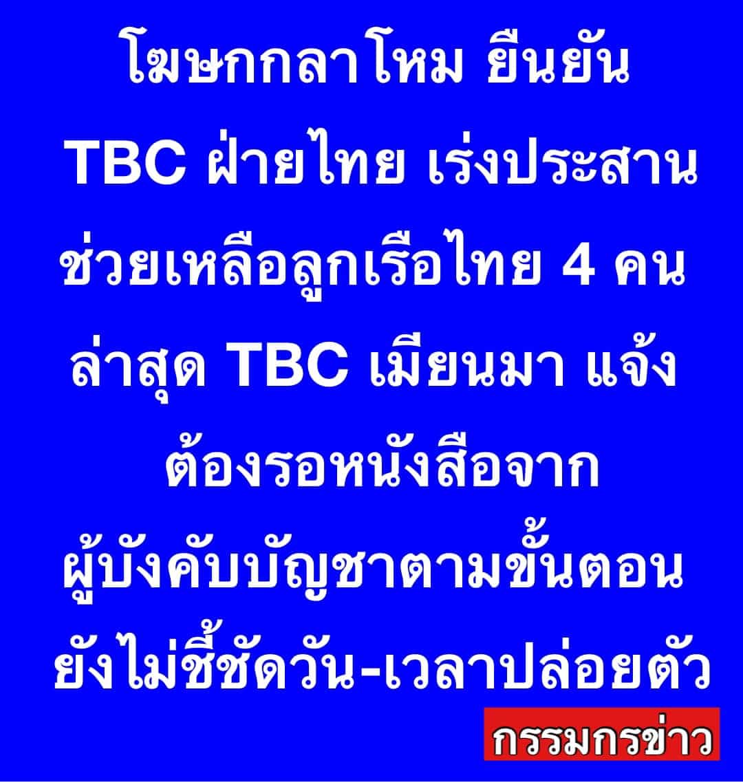 โฆษกกระทรวงกลาโหม ยืนยัน TBC ฝ่ายไทย เร่งประสานช่วยเหลือลูกเรือไทย 4 คน ล่าสุด TBC เมียนมา แจ้งว่า ต้องรอหนังสือจากผู้บังคับบัญชาตามขั้นตอนทางกฎหมาย ยังไม่ชี้ชัดวัน-เวลา ปล่อยตัว