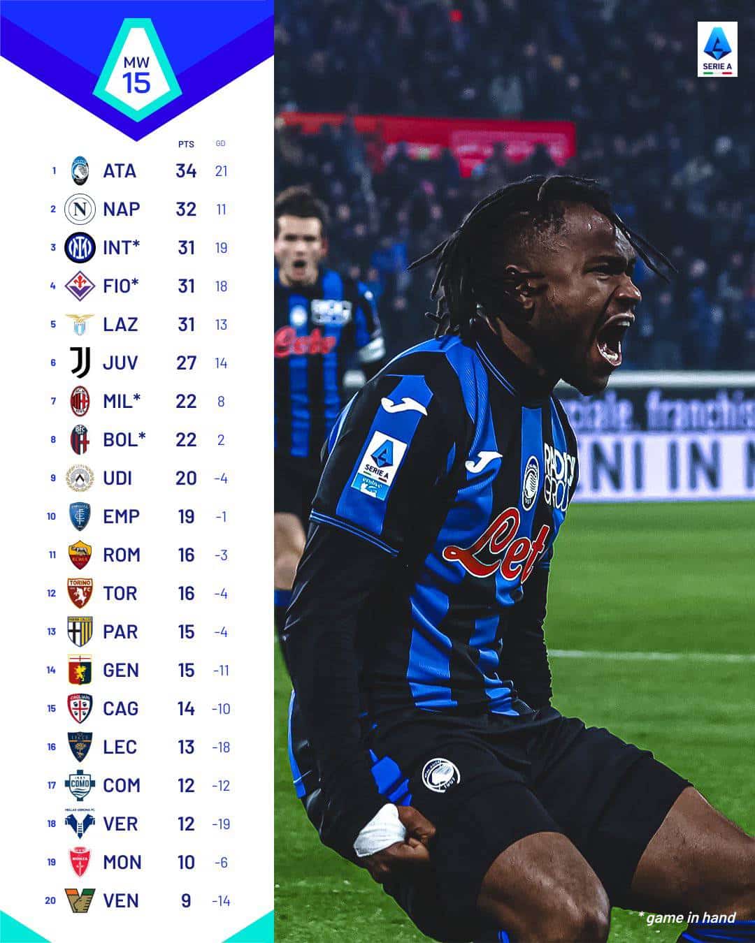 สรุปผลการแข่งขัน กัลโช่ เซเรียอา 2024/25 หลังจบนัดที่ 15