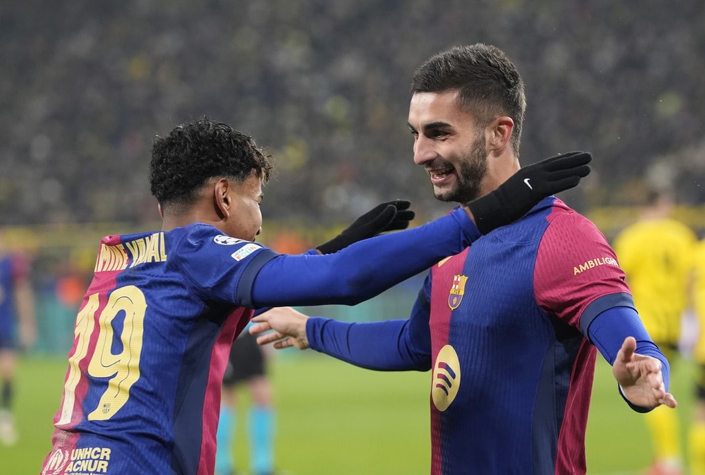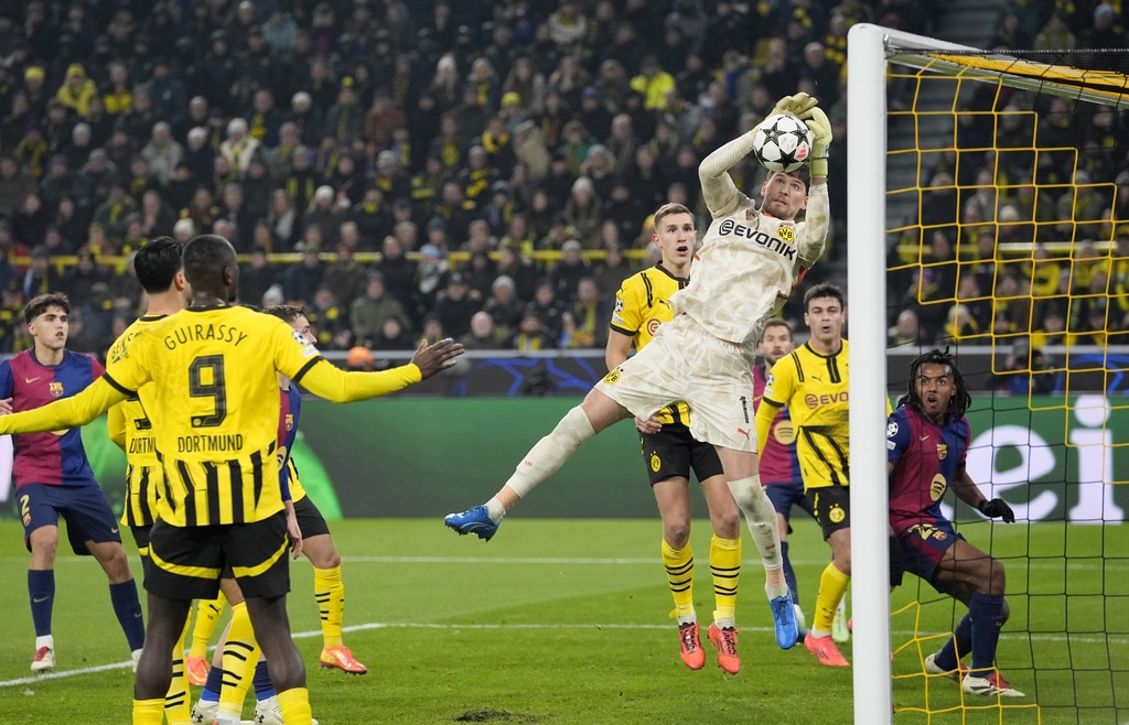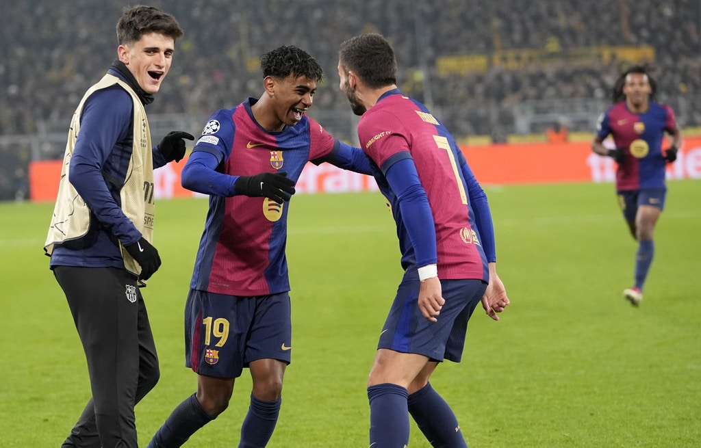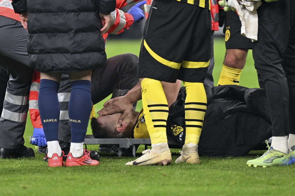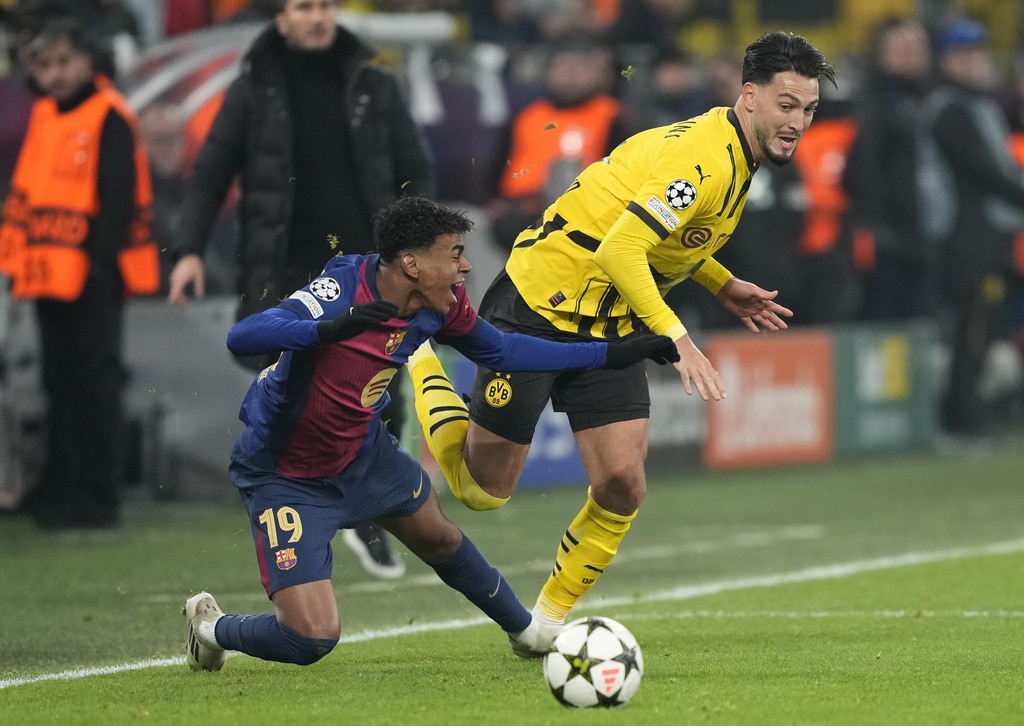 Barcelona’s Lamine Yamal fights for the ball against Dortmund’s Ramy Bensebaini during the Champions League opening phase soccer match between Borussia Dortmund and FC Barcelona at the Signal-Iduna Park in Dortmund, Germany, Wednesday Dec. 11, 2024. (AP Photo/Martin Meissner)Barcelona’s Ferran Torres celebrates his side’s second goal with Barcelona’s Lamine Yamal during the Champions League opening phase soccer match between Borussia Dortmund and FC Barcelona at the Signal-Iduna Park in Dortmund, Germany, Wednesday Dec. 11, 2024. (AP Photo/Martin Meissner)Dortmund’s Serhou Guirassy celebrates his side’s second goal during the Champions League opening phase soccer match between Borussia Dortmund and FC Barcelona at the Signal-Iduna Park in Dortmund, Germany, Wednesday Dec. 11, 2024. (AP Photo/Martin Meissner)Barcelona’s Ferran Torres celebrates his side’s third goal with Barcelona’s Lamine Yamal during the Champions League opening phase soccer match between Borussia Dortmund and FC Barcelona at the Signal-Iduna Park in Dortmund, Germany, Wednesday Dec. 11, 2024. (AP Photo/Martin Meissner)Dortmund’s Nico Schlotterbeck reacts on a stretcher before he is carried off the pitch following an injury during the Champions League opening phase soccer match between Borussia Dortmund and FC Barcelona at the Signal-Iduna Park in Dortmund, Germany, Wednesday Dec. 11, 2024. (Bernd Thissen/dpa via AP)Dortmund’s goalkeeper Gregor Kobel leaves the field at the end of the Champions League opening phase soccer match between Borussia Dortmund and FC Barcelona at the Signal-Iduna Park in Dortmund, Germany, Wednesday Dec. 11, 2024. (AP Photo/Martin Meissner)Dortmund’s goalkeeper Gregor Kobel jumps for the ball during the Champions League opening phase soccer match between Borussia Dortmund and FC Barcelona at the Signal-Iduna Park in Dortmund, Germany, Wednesday Dec. 11, 2024. (AP Photo/Martin Meissner)Barcelona’s Ferran Torres celebrates his side’s third goal during the Champions League opening phase soccer match between Borussia Dortmund and FC Barcelona at the Signal-Iduna Park in Dortmund, Germany, Wednesday Dec. 11, 2024. (AP Photo/Martin Meissner)Barcelona’s Ferran Torres celebrates his side’s third goal during the Champions League opening phase soccer match between Borussia Dortmund and FC Barcelona at the Signal-Iduna Park in Dortmund, Germany, Wednesday Dec. 11, 2024. (AP Photo/Martin Meissner)