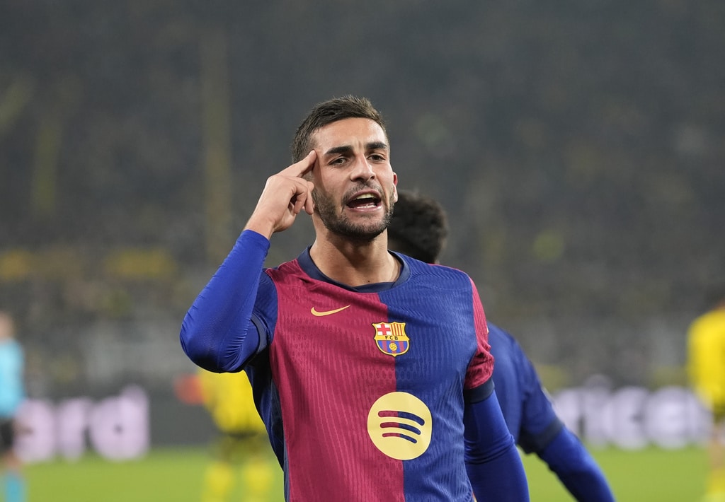 Barcelona’s Ferran Torres celebrates his side’s second goal during the Champions League opening phase soccer match between Borussia Dortmund and FC Barcelona at the Signal-Iduna Park in Dortmund, Germany, Wednesday Dec. 11, 2024. (AP Photo/Martin Meissner)