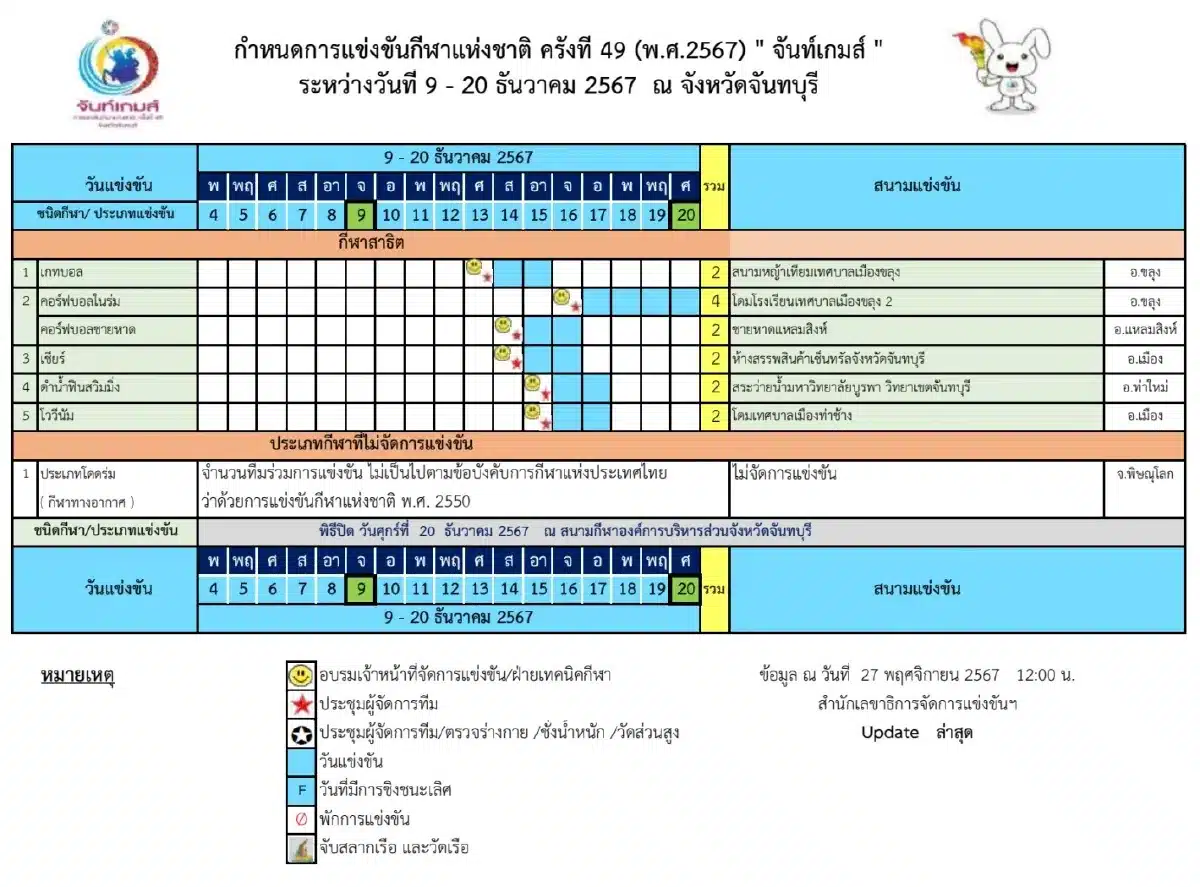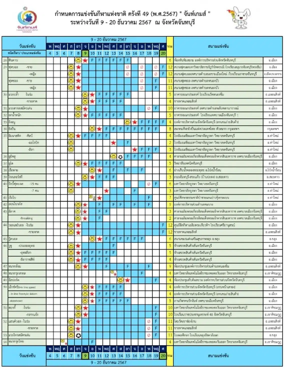 ตารางการแข่งขัน ‘จันท์เกมส์’ กีฬาแห่งชาติ ครั้งที่ 49 ‘จันท์เกมส์’ 9-20 ธ.ค.67