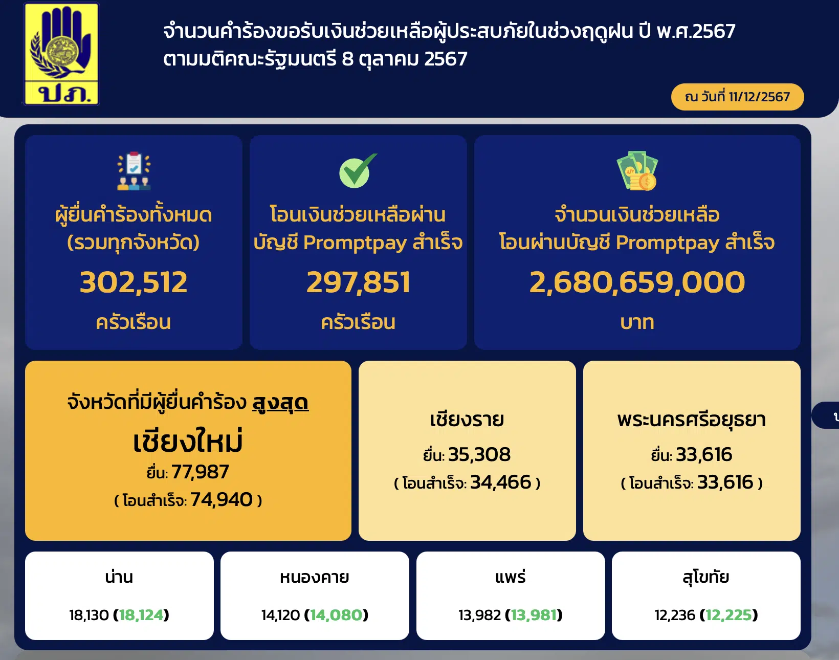 - ยอดเงินช่วยเหลือรวม: 2,680,659,000 บาท