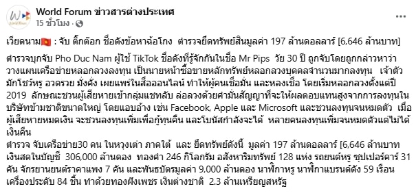 ตำรวจบุกจับ Pho Duc Nam ผู้ใช้ TikTok ชื่อดังที่รู้จักกันในชื่อ Mr Pips วัย 30 ปี ถูกจับโดยถูกกล่าวหาว่าวางแผนเครือข่ายหลอกลวงลงทุน เป็นนายหน้าซื้อขายหลักทรัพย์หลอกลวงบุคคลจำนวนมากลงทุน เจ้าตัวมักโชว์หรู อวดรวย มั่งคั่ง เผยแพร่ในสื่อออนไลน์ ทำให้ผู้คนเชื่อมั่น และหลงเชื่อ
