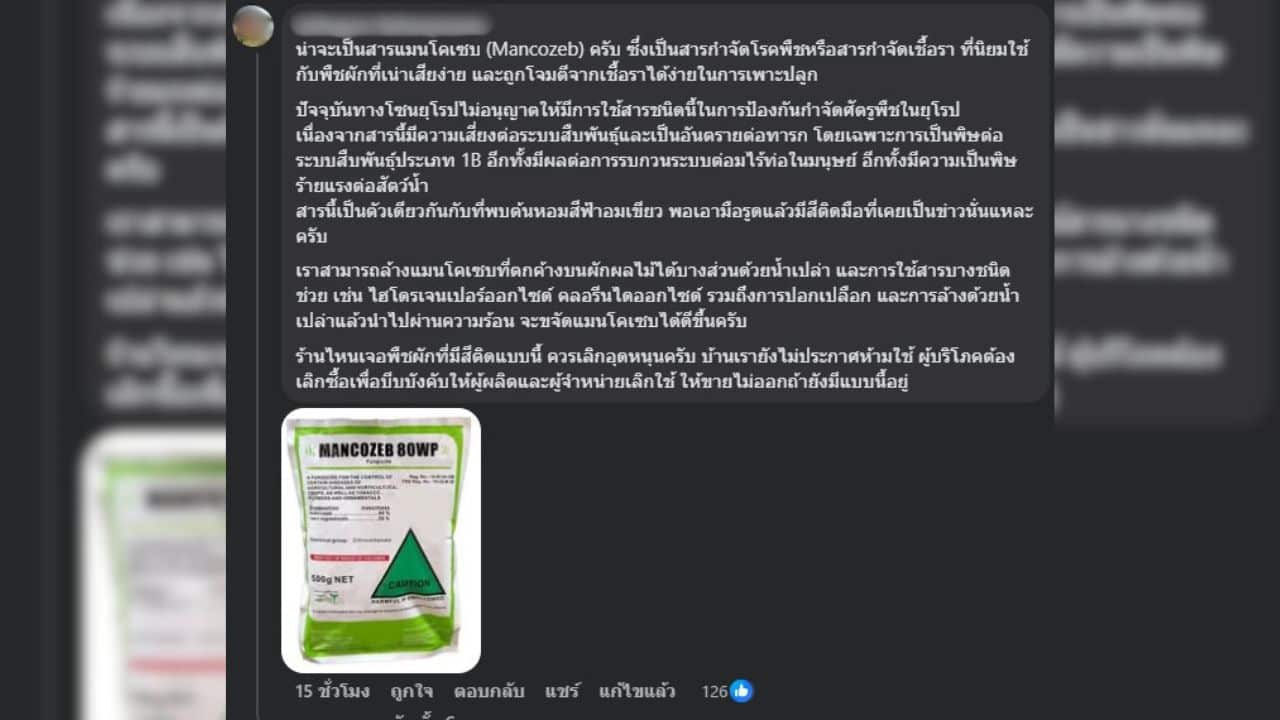 หลังจากที่โพสต์ลงไป ก็มีหลายคนที่เข้ามาแสดงความคิดเห็นกันอย่างมากมาย ก่อนที่จะมีการเผยว่าคราบสีฟ้าดังกล่าวน่าจะเป็น แมนโคเซบ (Mancozeb) ซึ่งเป็นสารกำจัดโรคบนพืช หรือก็คือสารกำจัดเชื้อราที่นิยมใช้ในพืชผักที่น่าเสียง่าย รวมไปถึงพืชผักที่ถูกเชื้อราโจมตีได้ง่ายในการเพาะปลูก