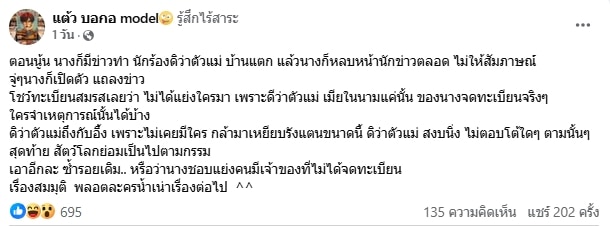 “ตอนนู้น นางก็มีข่าวทำ นักร้องดิว่าตัวแม่ บ้านแตก แล้วนางก็หลบหน้านักข่าวตลอด ไม่ให้สัมภาษณ์