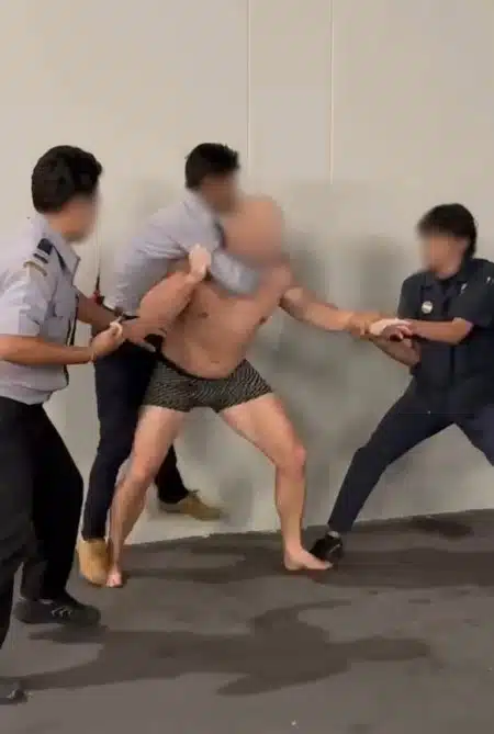 ทว่านักท่องเที่ยวรายนี้กลับแสดงอาการขัดขืน-ทำร้ายเจ้าหน้าที่ ทำลายทรัพย์สินโดยรอบ จนใช้เวลาพักใหญ่กว่าจะนำตัวมาที่สถานีตำรวจเพื่อสงบสติอารมณ์ เนื่องจากต้องปฏิบัติตามหลักการใช้กำลังจากเบาไปหาหนักเนื่องจากอีกฝ่ายเป็นนักท่องเที่ยวที่ไม่มีอาวุธ