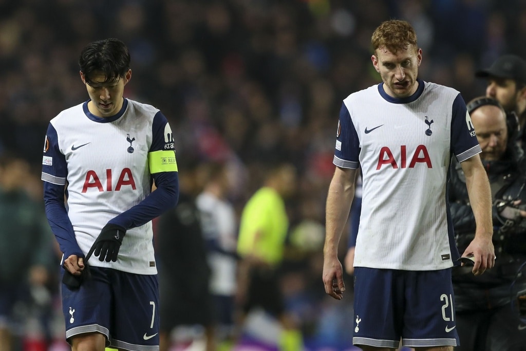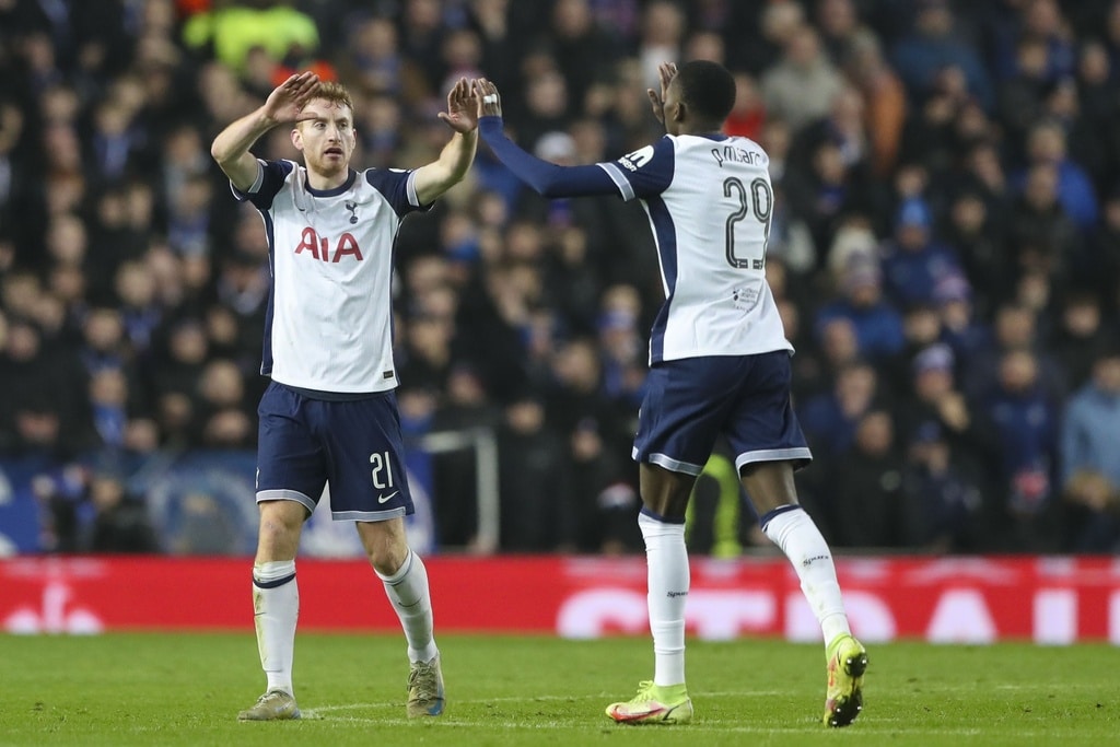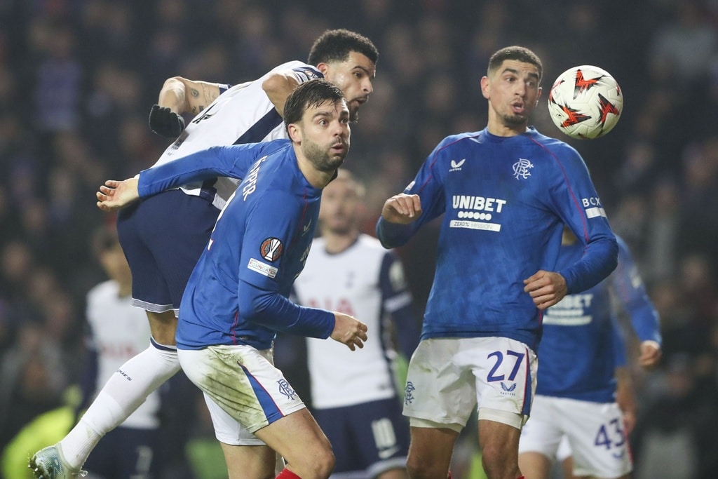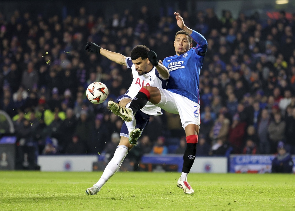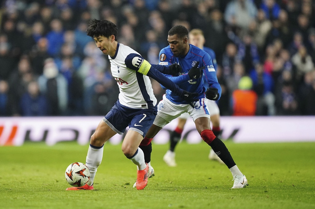 Tottenham Hotspur’s Son Heung-Min, left, shields the ball from Rangers’ Dujon Sterling during a UEFA Europa League soccer match at the Ibrox Stadium, Thursday, Dec. 12, 2024, in Glasgow, Scotland. (Steve Welsh/PA via AP)Tottenham Hotspur’s Dominic Solanke, left and Rangers’ James Tavernier battle for the ball during a UEFA Europa League soccer match at the Ibrox Stadium, Thursday, Dec. 12, 2024, in Glasgow, Scotland. (Steve Welsh/PA via AP)Tottenham’s James Maddison leaves the pitch after the Europa League opening phase soccer match between Glasgow Rangers and Tottenham Hotspur at Ibrox stadium in Glasgow, Thursday, Dec. 12, 2024. (AP Photo/Scott Heppell)Tottenham’s Son Heung-min and Tottenham’s Dejan Kulusevski leave the pitch after the Europa League opening phase soccer match between Glasgow Rangers and Tottenham Hotspur at Ibrox stadium in Glasgow, Thursday, Dec. 12, 2024. (AP Photo/Scott Heppell)Tottenham’s Dominic Solanke, top left, take a header during the Europa League opening phase soccer match between Glasgow Rangers and Tottenham Hotspur at Ibrox stadium in Glasgow, Thursday, Dec. 12, 2024. (AP Photo/Scott Heppell)Tottenham’s Dejan Kulusevski, right, in action during the Europa League opening phase soccer match between Glasgow Rangers and Tottenham Hotspur at Ibrox stadium in Glasgow, Thursday, Dec. 12, 2024. (AP Photo/Scott Heppell)Tottenham Hotspur’s Dejan Kulusevski celebrates scoring their side’s first goal of the game against Rangers during a UEFA Europa League soccer match at the Ibrox Stadium, Thursday, Dec. 12, 2024, in Glasgow, Scotland. (Jane Barlow/PA via AP)Tottenham’s Dejan Kulusevski, left, celebrates with Tottenham’s Pape Matar Sarr after scoring his side’s first goal during the Europa League opening phase soccer match between Glasgow Rangers and Tottenham Hotspur at Ibrox stadium in Glasgow, Thursday, Dec. 12, 2024. (AP Photo/Scott Heppell)
