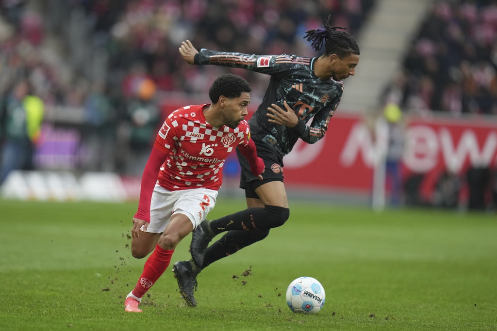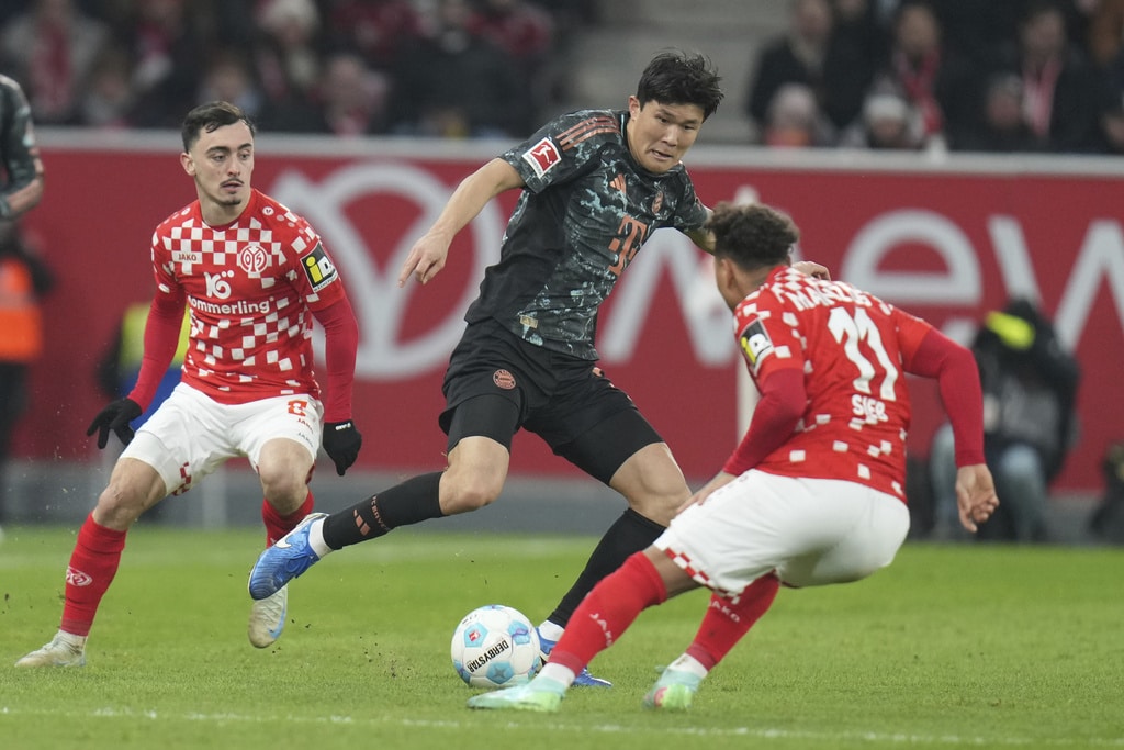 Bayern’s Thomas Müller, left, makes an overhead kick as Mainz’s Armindo Sieb, center, and Mainz’s Kaishu Sano defend during a Bundesliga soccer match between Bayern Munich and FSV Mainz 05, Saturday, Dec. 14, 2024, in Mainz, Germany. (Thomas Frey/dpa via AP)Mainz’s Paul Nebel, left, and Armindo Sieb, right, close in on Bayern’s Kim Min-jae during a Bundesliga soccer match between Bayern Munich and FSV Mainz 05, Saturday, Dec. 14, 2024, in Mainz, Germany. (Thomas Frey/dpa via AP)Bayern Munich’s Kim Min-jae Kimkeeps his eyes on the ball during a Bundesliga soccer match against FSV Mainz 05, Saturday, Dec. 14, 2024, in Mainz, Germany. (Thomas Frey/dpa via AP)Jae-sung Lee (2nd from left) from Mainz celebrates with his team after the 2-0 win of the Bundesliga soccer match between FSV Mainz 05 and Bayern Munich, at the Mewa Arena in Mainz, Germany, Saturday, Dec. 14, 2024. (Thomas Frey/dpa via AP)Bayern’s Michael Olise, right, and Mainz’s Phillipp Mwene fight for the ball during the Bundesliga soccer match between FSV Mainz 05 and Bayern Munich, at the Mewa Arena in Mainz, Germany, Saturday, Dec. 14, 2024. (Thomas Frey/dpa via AP)