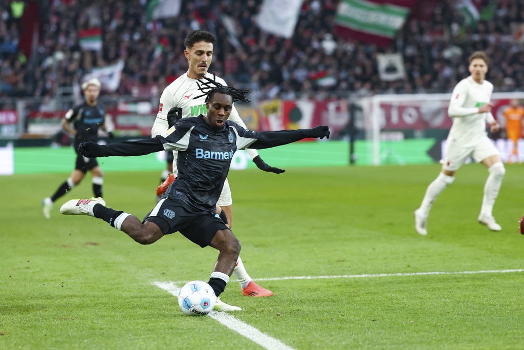Jeremie Frimpong of Bayer Leverkusen, front, against Dimitrios Giannoulis during the Bundesliga soccer match between FC Augsburg and Bayer Leverkusen at the WWK-Arena in Augsburg, Germany, Saturday, Dec. 14, 2024. (Daniel Löb/dpa via AP)Phillip Tietz from FC Augsburg in action during the Bundesliga soccer match between FC Augsburg and Bayer Leverkusen at the WWK-Arena in Augsburg, Germany, Saturday, Dec. 14, 2024. (Daniel Löb/dpa via AP)Coach Xabier Alonso of Bayer Leverkusen gives instructions to his team during the Bundesliga soccer match between FC Augsburg and Bayer Leverkusen at the WWK-Arena in Augsburg, Germany, Saturday, Dec. 14, 2024. (Daniel Löb/dpa via AP)Martin Terrier of Bayer Leverkusen, 2nd from right, celebrates after scoring his side’s first goal, during the Bundesliga soccer match between FC Augsburg and Bayer Leverkusen at the WWK-Arena in Augsburg, Germany, Saturday, Dec. 14, 2024. (Daniel Löb/dpa via AP)From left, Nathan Tella of Bayer Leverkusen and Arne Maier and Dimitrios Giannoulis of Augsburg in action during the Bundesliga soccer match between FC Augsburg and Bayer Leverkusen at the WWK-Arena in Augsburg, Germany, Saturday, Dec. 14, 2024. (Daniel Löb/dpa via AP)
