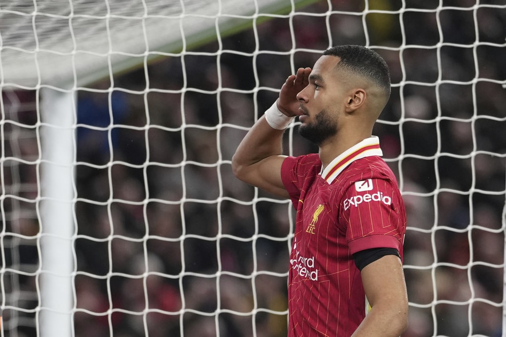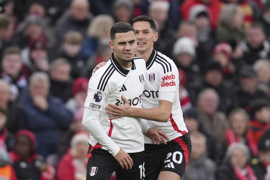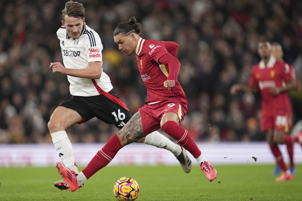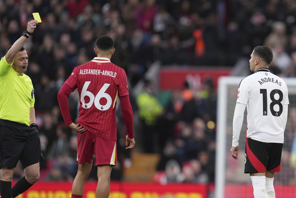 Referee Tony Harrington, left, shows a yellow card to Fulham’s Andreas Pereira, right, during the English Premier League soccer match between Liverpool and Fulham, at Anfield stadium in Liverpool, England, Saturday, Dec. 14, 2024. (AP Photo/Jon Super)Liverpool’s manager Arne Slot gives a thumbs up at the end of the English Premier League soccer match between Liverpool and Fulham, at Anfield stadium in Liverpool, England, Saturday, Dec. 14, 2024. (AP Photo/Jon Super)Liverpool’s Darwin Nunez, center, duels for the ball with Fulham’s Sander Berge during the English Premier League soccer match between Liverpool and Fulham, at Anfield stadium in Liverpool, England, Saturday, Dec. 14, 2024. (AP Photo/Jon Super)Liverpool’s Mohamed Salah, center, duels for the ball with Fulham’s Jorge Cuenca during the English Premier League soccer match between Liverpool and Fulham, at Anfield stadium in Liverpool, England, Saturday, Dec. 14, 2024. (AP Photo/Jon Super)Liverpool’s Cody Gakpo celebrates after scoring his side’s opening goal during the English Premier League soccer match between Liverpool and Fulham, at Anfield stadium in Liverpool, England, Saturday, Dec. 14, 2024. (AP Photo/Jon Super)Liverpool’s Cody Gakpo celebrates with Liverpool’s Luis Diaz, top, after scoring his side’s opening goal during the English Premier League soccer match between Liverpool and Fulham, at Anfield stadium in Liverpool, England, Saturday, Dec. 14, 2024. (AP Photo/Jon Super)Fulham’s Andreas Pereira, left, celebrates with Fulham’s Sasa Lukic after scoring his side’s opening goal during the English Premier League soccer match between Liverpool and Fulham, at Anfield stadium in Liverpool, England, Saturday, Dec. 14, 2024. (AP Photo/Jon Super)