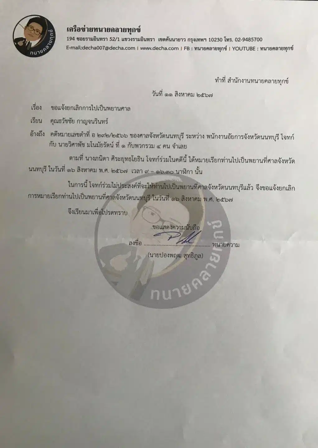 ในการนี้ โจทก์ร่วมไม่ประสงค์ที่จะให้ท่านไปเป็นพยานที่ศาลจังหวัดนนทบุรีแล้ว จึงขอแจ้งยกเลิก การหมายเรียกท่านไปเป็นพยานที่ศาลจังหวัดนนทบุรี ในวันที่ 12 สิงหาคม พ.ศ. 2567”