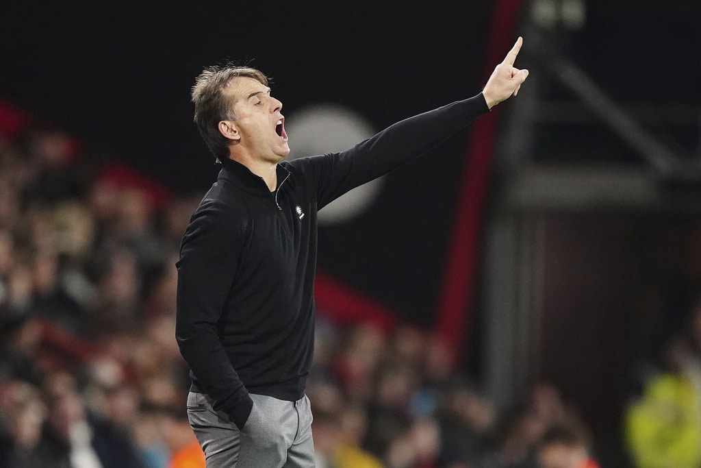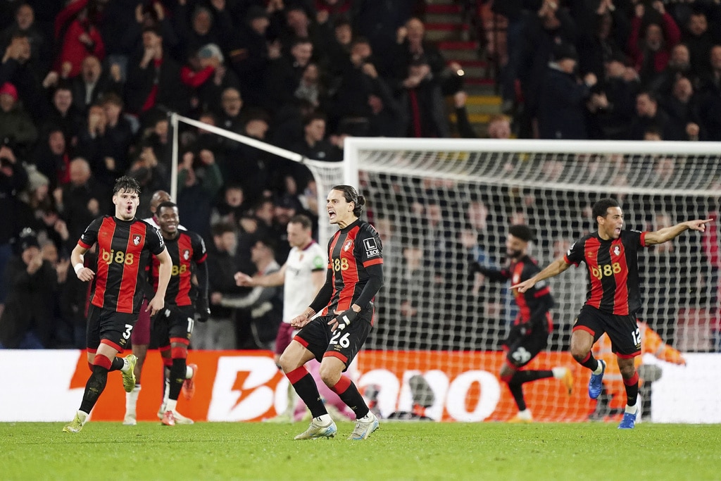 Bournemouth’s Enes Unal reacts after scoring his side’s first goal of the game from a free-kick during the English Premier League soccer match between Bournemouth and West Ham United, at the Vitality Stadium, in Bournemouth, England, Monday, Dec. 16, 2024. (Zac Goodwin/PA via AP)