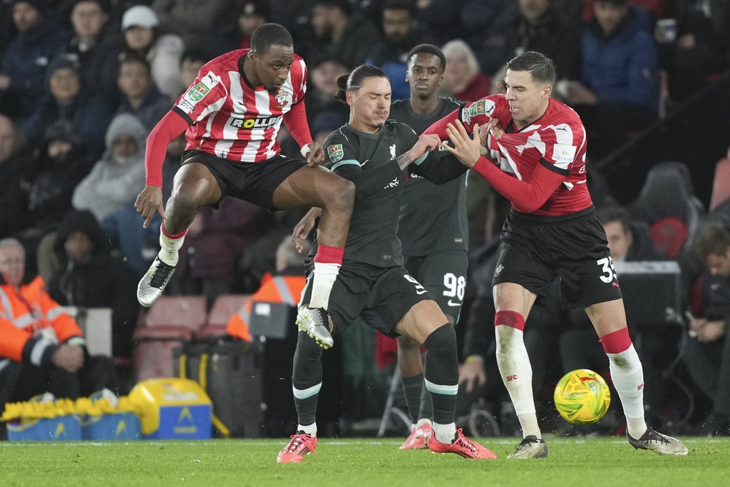 Liverpoo players celebrate after scoring during the English Football Lague Cup soccer match between Southampton and Liverpool in Southampton, England, on Wednesday, Dec.18, 2024. (AP Photo/Sean Ryan)Liverpool’s Harvey Elliott scores during the English Football Lague Cup soccer match between Southampton and Liverpool in Southampton, England, on Wednesday, Dec.18, 2024. (AP Photo/Sean Ryan)Liverpool’s Darwin Nunez in action between Southampton’s Joe Aribo, left, and Southampton’s Ryan Manning during the English Football Lague Cup soccer match between Southampton and Liverpool in Southampton, England, on Wednesday, Dec.18, 2024. (AP Photo/Sean Ryan)Southampton’s Joe Aribo, left, and Liverpool’s Wataru Endo fight for the ball during the English Football Lague Cup soccer match between Southampton and Liverpool in Southampton, England, on Wednesday, Dec.18, 2024. (AP Photo/Sean Ryan)Liverpool’s Harvey Elliott, left, and Southampton’s Mateus Fernandes fight for the ball during the English Football Lague Cup soccer match between Southampton and Liverpool in Southampton, England, on Wednesday, Dec.18, 2024. (AP Photo/Sean Ryan)Liverpool’s Harvey Elliott receives the ball during the English Football Lague Cup soccer match between Southampton and Liverpool in Southampton, England, on Wednesday, Dec.18, 2024. (AP Photo/Sean Ryan)Liverpool’s Trent Alexander-Arnold guards Southampton’s Kamaldeen Sulemana during the English Football Lague Cup soccer match between Southampton and Liverpool in Southampton, England, on Wednesday, Dec.18, 2024. (AP Photo/Sean Ryan)Liverpool’s Harvey Elliott shoots during the English Football Lague Cup soccer match between Southampton and Liverpool in Southampton, England, on Wednesday, Dec.18, 2024. (AP Photo/Sean Ryan)