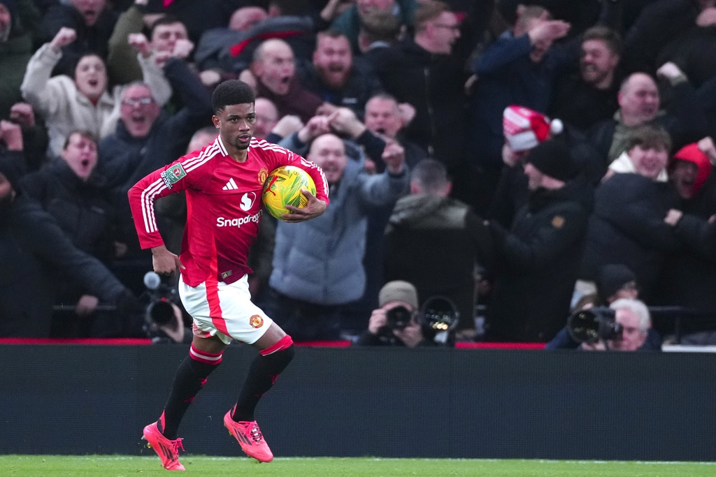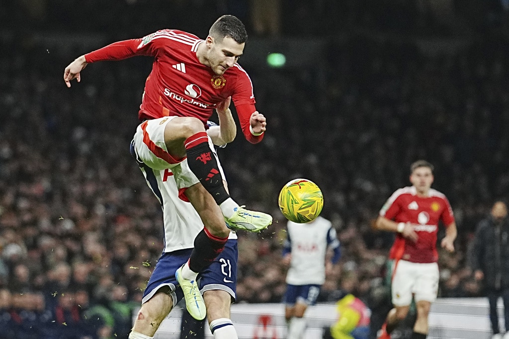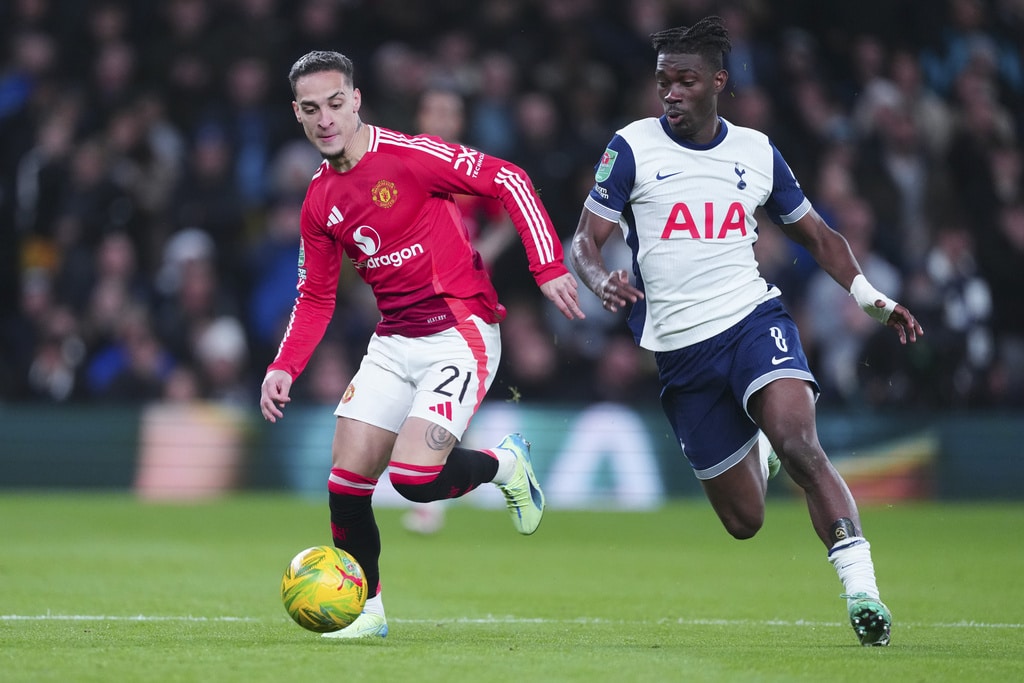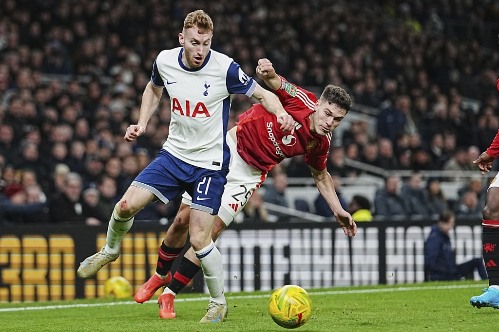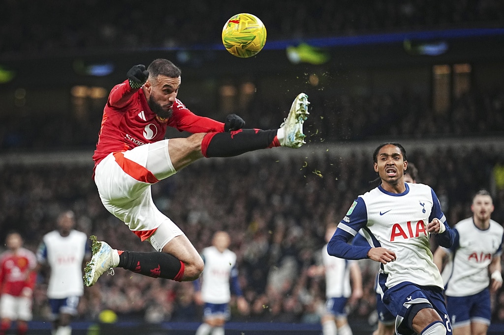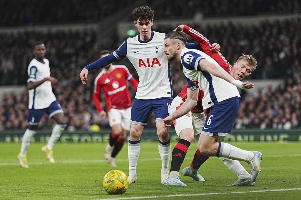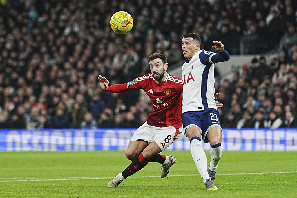 Manchester United’s Antony, left, challenges for the ball with Tottenham’s Yves Bissouma during the English League Cup quarter-final soccer match between Tottenham and Manchester United, at the Tottenham Hotspur Stadium in London, Thursday, Dec. 19, 2024. (AP Photo/Dave Shopland )Tottenham’s Son Heung-min, right, celebrates after scoring his side’s fourth goal during the English League Cup quarter-final soccer match between Tottenham and Manchester United, at the Tottenham Hotspur Stadium in London, Thursday, Dec. 19, 2024. (AP Photo/Dave Shopland )Manchester United’s Amad Diallo celebrates after scoring his side’s second goal during the English League Cup quarter-final soccer match between Tottenham and Manchester United, at the Tottenham Hotspur Stadium in London, Thursday, Dec. 19, 2024. (AP Photo/Dave Shopland )Tottenham’s Dejan Kulusevski, left, challenges for the ball with Manchester United’s Manuel Ugarte during the English League Cup quarter-final soccer match between Tottenham and Manchester United, at the Tottenham Hotspur Stadium in London, Thursday, Dec. 19, 2024. (AP Photo/Dave Shopland )Manchester United’s Diogo Dalot kicks the ball ahead of Tottenham’s Dejan Kulusevski during the English League Cup quarter-final soccer match between Tottenham and Manchester United, at the Tottenham Hotspur Stadium in London, Thursday, Dec. 19, 2024. (AP Photo/Dave Shopland )Manchester United’s Noussair Mazraoui in action during the English League Cup quarter-final soccer match between Tottenham and Manchester United, at the Tottenham Hotspur Stadium in London, Thursday, Dec. 19, 2024. (AP Photo/Dave Shopland )Tottenham’s Archie Gray, centre, Tottenham’s Radu Dragusin challenges for the ball with Manchester United’s Rasmus Hojlund, right, during the English League Cup quarter-final soccer match between Tottenham and Manchester United, at the Tottenham Hotspur Stadium in London, Thursday, Dec. 19, 2024. (AP Photo/Dave Shopland )Tottenham’s Pedro Porro, right, challenges for the ball with Manchester United’s Bruno Fernandes during the English League Cup quarter-final soccer match between Tottenham and Manchester United, at the Tottenham Hotspur Stadium in London, Thursday, Dec. 19, 2024. (AP Photo/Dave Shopland )