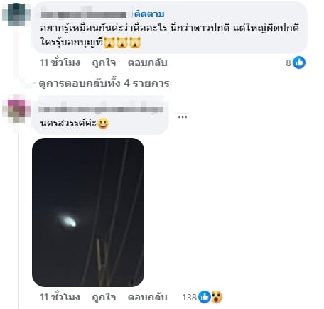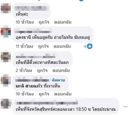 ขณะที่ชาวเน็ตหลายคนในหลายพื้นที่ต่างก็เข้ามาแสดงความคิดเห็นใต้โพสต์ของสมาคมดาราศาสตร์ไทยกันอย่างมากมายไม่ว่าจะเป็นในจ.สุพรรณบุรี, ศรีสะเกษ, ชัยภูมิ, นครสวรรค์, ลพบุรี, แพร่, ขอนแก่น ก็เห็นลำแสงประหลาดนี้เช่นกัน และอยากจะรู้ว่ามันคือแสงอะไรกันแน่ บ้างก็คิดว่าเป็นดาวหาง เป็นแสงเครื่องบิน เป็นดวงดาว แต่สุดท้ายเมื่อได้มาเห็นประกาศของสมาคมถึงได้รู้ว่ามันไม่ใช่