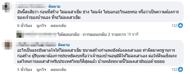 เมื่อมาดูที่ช่องคอมเมนต์ก็มีชาวเน็ตหลาย ๆ คนเข้ามาสอบถาม รวมถึงให้ความรู้เกี่ยวกับการลงเสาเข็ม และการถมพื้นดินให้สูงขึ้นจากเดิน เมื่อได้ทราบสาเหตุของการถล่มในครั้งนี้ว่า บ้านหลังนี้ไม่มีการตอกเสาเข็มยึดตัวบ้านเอาไว้เลย อีกทั้งสร้างบ้านใกล้กับขอบดินที่เพิ่งถมมากเกินไปทำให้เกิดเหตุการณ์ดังกล่าวขึ้น นอกจากนั้นก็ทุกคนก้ยังร่วมส่งกำลังใจให้กับเจ้าของบ้านหลังนี้ไปพร้อม ๆ กันด้วย