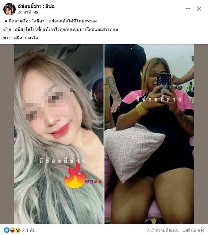 เพจอีซ้อ ขยี้ไม่หยุด ล่าสุดเปิดหน้าจริง “สุนิสา” จิ้งจอกสาวพราวเสน่ห์ พบวีรกรรมโชกโชน เที่ยวหลอกไปทั่ว เข้า-ออกคุก 5 รอบไม่สำนึก ออกมาตุ๋นบาร์โฮสต่ออีก