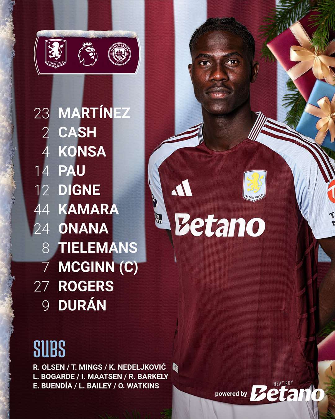 21 ธันวาคม 2567 รายชื่อผู้เล่น 11 ตัวจริง แอสตัน วิลล่า พบ แมนซิตี้ ศึกฟุตบอล พรีเมียร์ลีก ฤดูกาล 2024-25 คืนนี้ ลิงก์ถูกลิขสิทธิ์ ดูบอลสดออนไลน์ ทาง True Premier Football เวลา 19:30 น.