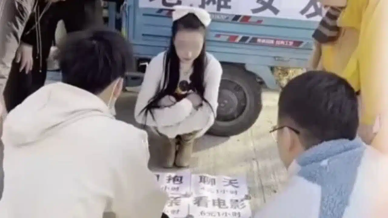 เมื่อเร็วๆนี้ ในเมืองเซินเจิ้น มณฑลกวางตุ้ง มีแผงลอยจำนวนมากที่ให้บริการเดทแบบรายชั่วโมง รวมถึงการกอดและจูบ โดยคิดค่าบริการเป็นเงิน ที่บริเวณข้างสถานีรถไฟใต้ดินแห่งหนึ่งในเซินเจิ้น มีหญิงสาวคนหนึ่งตั้งแผงลอยพร้อมป้ายราคา ระบุว่า “กอด 1 หยวน (ประมาณ 4.7 บาท), จูบ 10 หยวน (ประมาณ 47 บาท), ดูหนังด้วยกัน 15 หยวน (ประมาณ 70.48 บาท)”