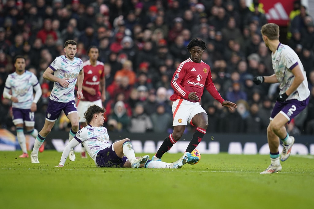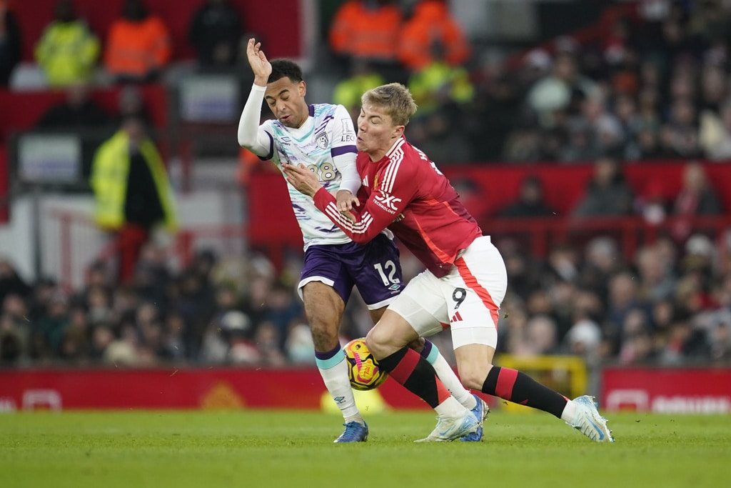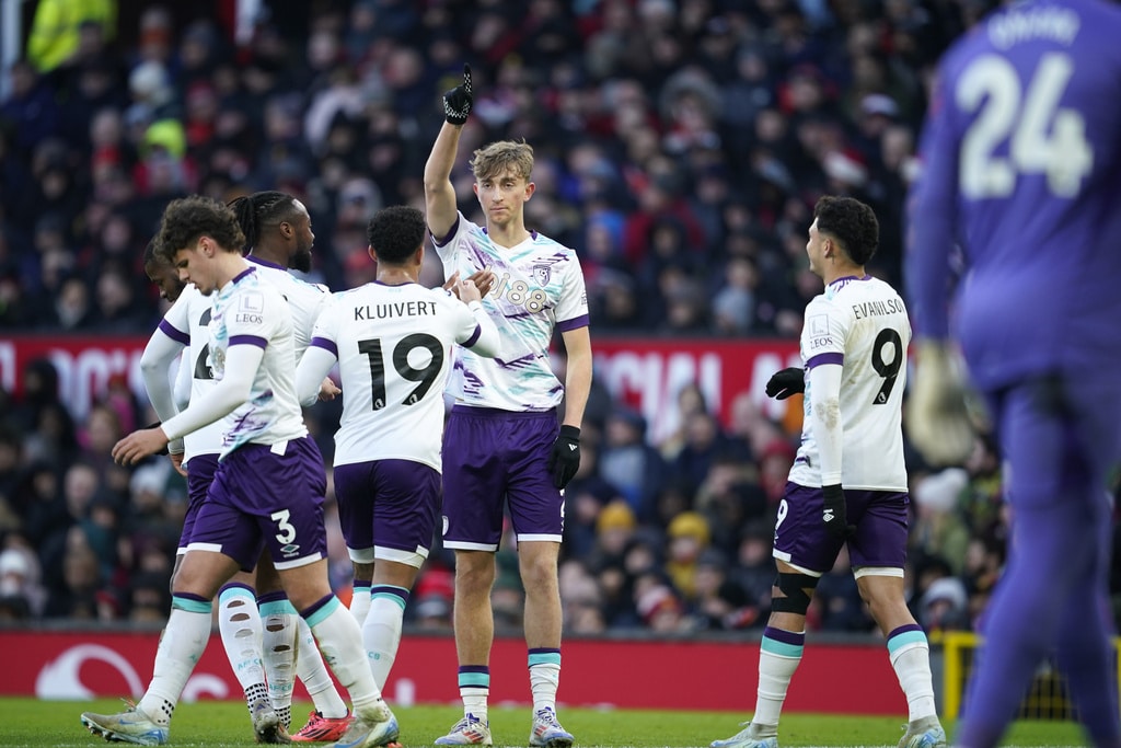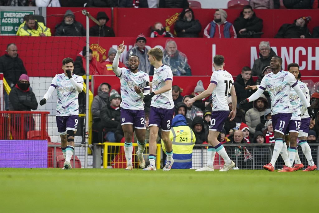 Bournemouth’s Dean Huijsen celebrates after scoring his side’s first goal during the English Premier League soccer match between Manchester United and Bournemouth at the Old Trafford stadium in Manchester, England, Sunday, Dec. 22, 2024. (AP Photo/Dave Thompson)Manchester United’s Bruno Fernandes gestures in frustration during the English Premier League soccer match between Manchester United and Bournemouth at the Old Trafford stadium in Manchester, England, Sunday, Dec. 22, 2024. (AP Photo/Dave Thompson)Manchester United’s Rasmus Hojlund challenges for the ball with Bournemouth’s Tyler Adams during the English Premier League soccer match between Manchester United and Bournemouth at the Old Trafford stadium in Manchester, England, Sunday, Dec. 22, 2024. (AP Photo/Dave Thompson)Manchester United’s Rasmus Hojlund challenges for the ball with Bournemouth’s Tyler Adams during the English Premier League soccer match between Manchester United and Bournemouth at the Old Trafford stadium in Manchester, England, Sunday, Dec. 22, 2024. (AP Photo/Dave Thompson)Manchester United’s Bruno Fernandes is dejected after his team conceded the third goal during the English Premier League soccer match between Manchester United and Bournemouth at the Old Trafford stadium in Manchester, England, Sunday, Dec. 22, 2024. (AP Photo/Dave Thompson)Bournemouth’s Antoine Semenyo celebrates after scoring his side’s third goal during the English Premier League soccer match between Manchester United and Bournemouth at the Old Trafford stadium in Manchester, England, Sunday, Dec. 22, 2024. (AP Photo/Dave Thompson)Bournemouth’s Milos Kerkez, challenges for the ball with Manchester United’s Kobbie Mainoo during the English Premier League soccer match between Manchester United and Bournemouth at the Old Trafford stadium in Manchester, England, Sunday, Dec. 22, 2024. (AP Photo/Dave Thompson)Manchester United’s Tyrell Malacia argues with line referee Akil Howson after a foul on Bournemouth’s Adam Smith during the English Premier League soccer match between Manchester United and Bournemouth at the Old Trafford stadium in Manchester, England, Sunday, Dec. 22, 2024. (AP Photo/Dave Thompson)