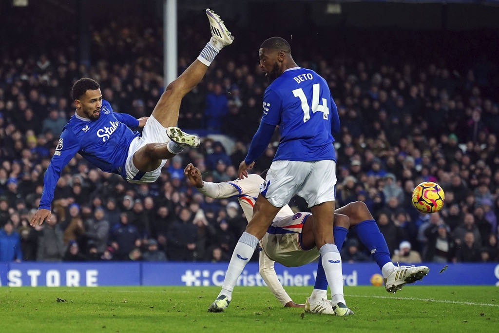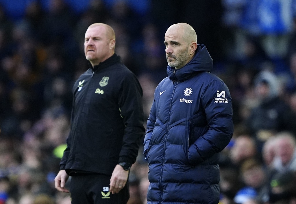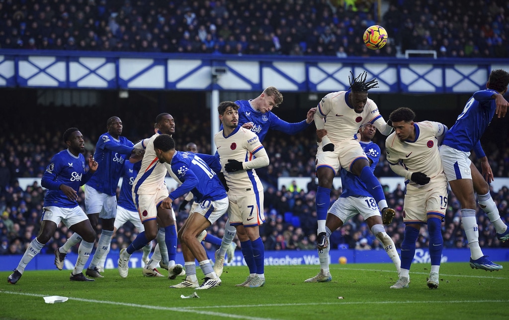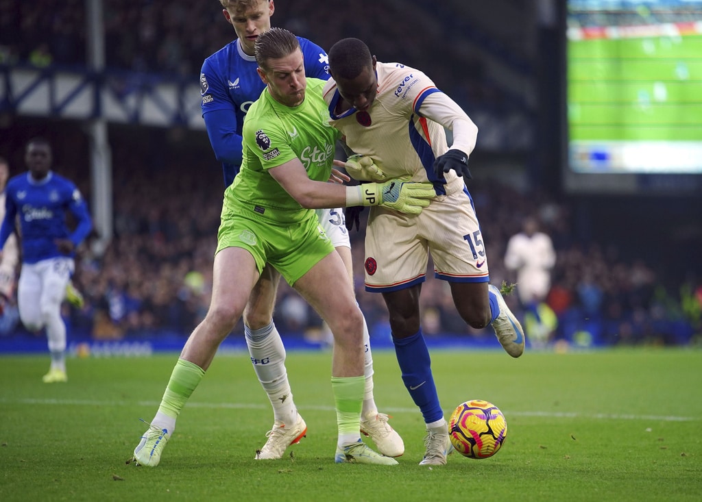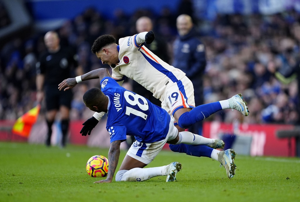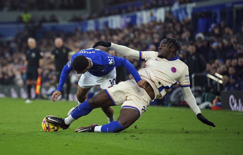 Everton manager Sean Dyche and Chelsea manager Enzo Maresca (right) during the English Premier League match soccer match between Everton and Chelsea, at Goodison Park, Liverpool, England, Sunday Dec. 22, 2024. (Peter Byrne/PA via AP)Chelsea’s Axel Disasi, right, fouls Everton’s Iliman Ndiaye during the English Premier League match soccer match between Everton and Chelsea, at Goodison Park, Liverpool, England, Sunday Dec. 22, 2024. (Peter Byrne/PA via AP)Chelsea’s Tosin Adarabioyo blocks a shot as Everton’s Beto and Iliman Ndiaye, left, try to get out of the way during the English Premier League match soccer match between Everton and Chelsea, at Goodison Park, Liverpool, England, Sunday Dec. 22, 2024. (Peter Byrne/PA via AP)Everton’s Ashley Young fouls Chelsea’s Jadon Sancho during the English Premier League match soccer match between Everton and Chelsea, at Goodison Park, Liverpool, England, Sunday Dec. 22, 2024. (Peter Byrne/PA via AP)Chelsea’s Axel Disasi heads the ball during the English Premier League match soccer match between Everton and Chelsea, at Goodison Park, Liverpool, England, Sunday Dec. 22, 2024. (Peter Byrne/PA via AP)Everton goalkeeper Jordan Pickford and Chelsea’s Nicolas Jackson (right) battle for the ball during the English Premier League match soccer match between Everton and Chelsea, at Goodison Park, Liverpool, England, Sunday Dec. 22, 2024. (Peter Byrne/PA via AP)