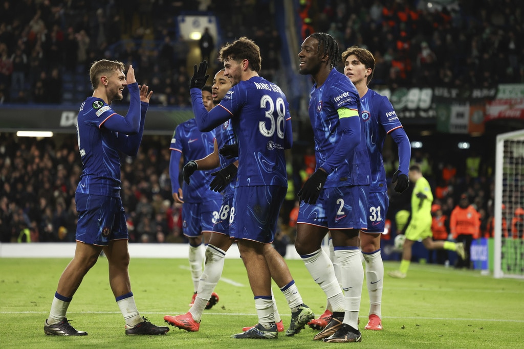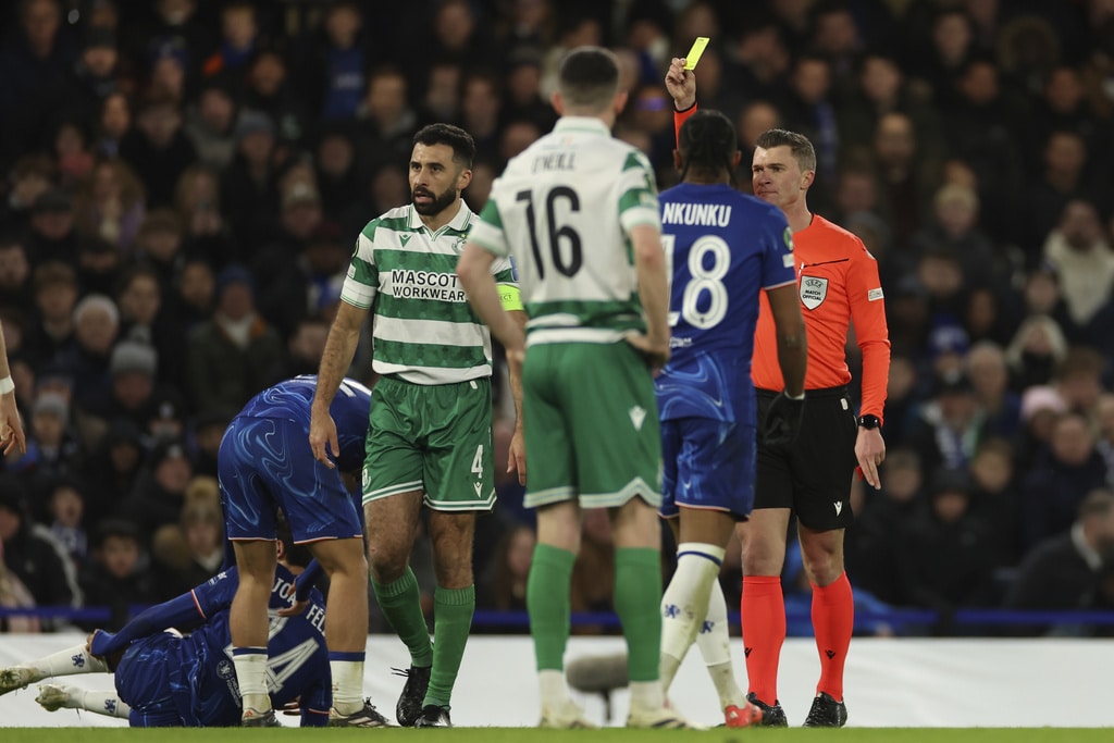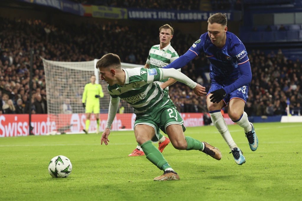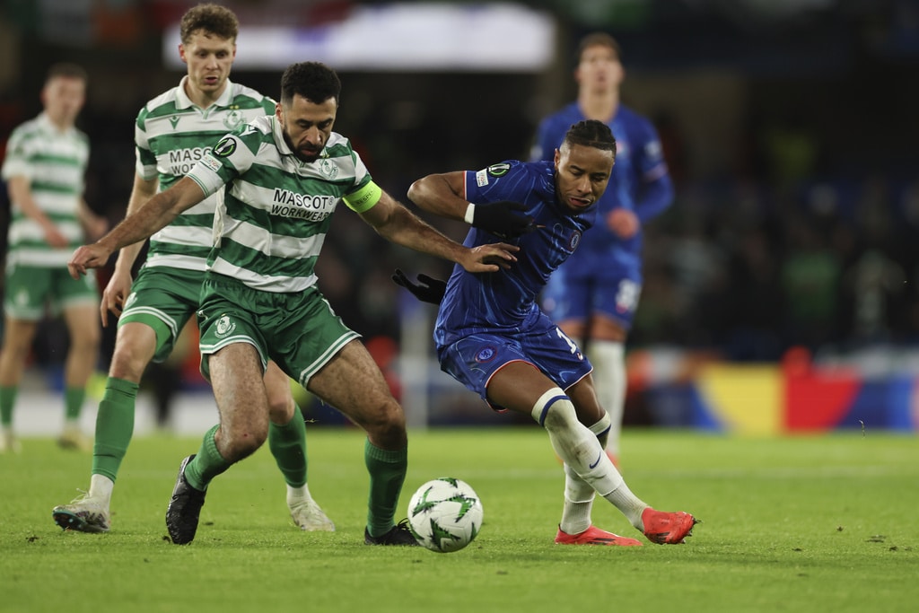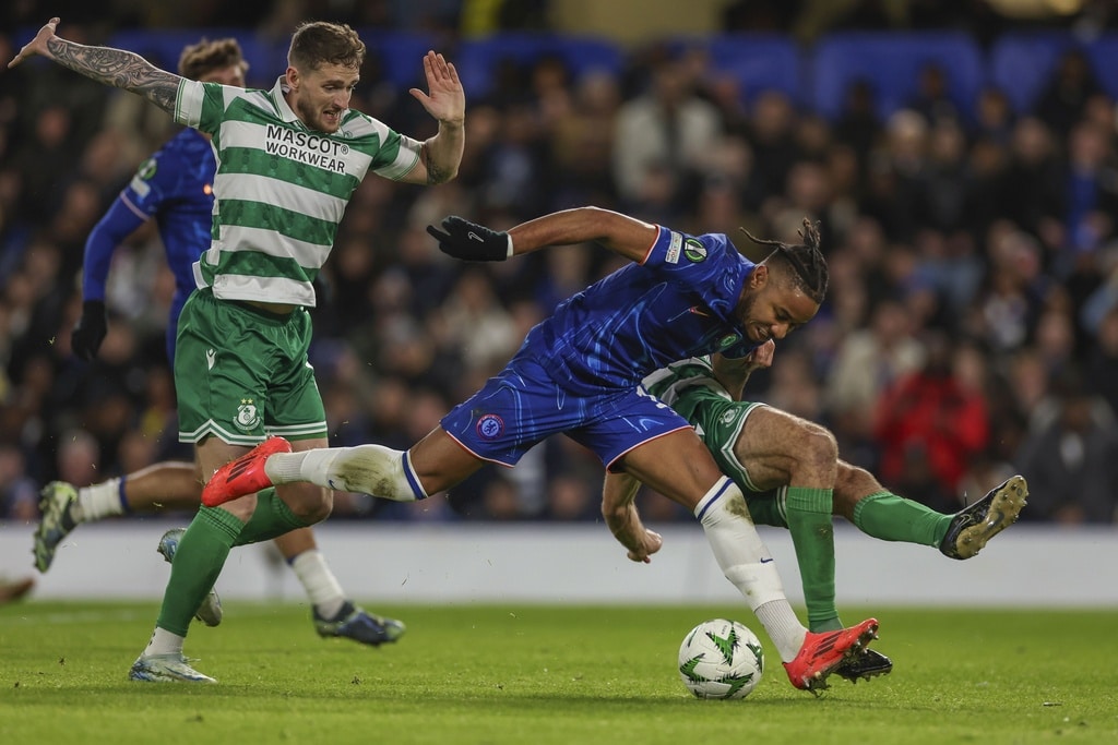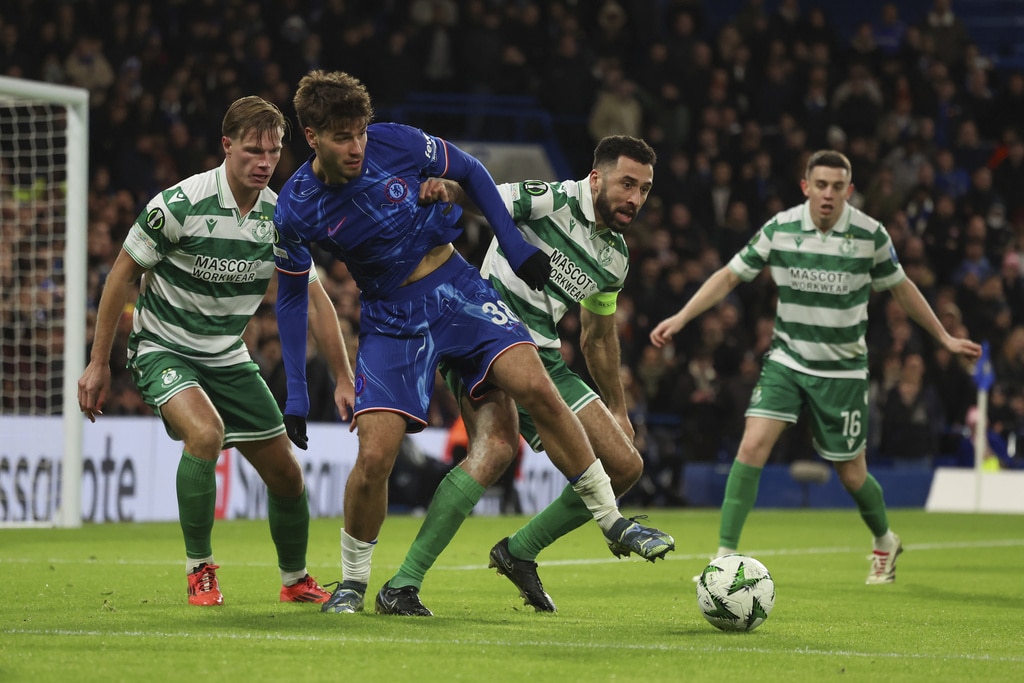 Chelsea’s Christopher Nkunku, center, is challenged by Shamrock Rovers’ Roberto Lopes, right, and Lee Grace during the Europa Conference League opening phase soccer match between Chelsea and Shamrock Rovers at Stamford Bridge stadium in London, Thursday, Dec. 19, 2024. (AP Photo/Ian Walton)Shamrock Rovers’ Roberto Lopes, left, and Chelsea’s Christopher Nkunku vie for the ball during the Europa Conference League opening phase soccer match between Chelsea and Shamrock Rovers at Stamford Bridge stadium in London, Thursday, Dec. 19, 2024. (AP Photo/Ian Walton)referee Willy Delajod shows a yellow card to Shamrock Rovers’ Roberto Lopes (4) during the Europa Conference League opening phase soccer match between Chelsea and Shamrock Rovers at Stamford Bridge stadium in London, Thursday, Dec. 19, 2024. (AP Photo/Ian Walton)Shamrock Rovers’s Cory O’Sullivan, left, and Chelsea’s Harvey Vale compete for the ball during the Europa Conference League opening phase soccer match between Chelsea and Shamrock Rovers at Stamford Bridge stadium in London, Thursday, Dec. 19, 2024. (AP Photo/Ian Walton)Chelsea’s Marc Guiu, front, is challenged by Shamrock Rovers Roberto Lopes during the Europa Conference League opening phase soccer match between Chelsea and Shamrock Rovers at Stamford Bridge stadium in London, Thursday, Dec. 19, 2024. (AP Photo/Ian Walton)Chelsea’s Marc Guiu (38) is congratulated after scoring his side’s 4th goal during the Europa Conference League opening phase soccer match between Chelsea and Shamrock Rovers at Stamford Bridge stadium in London, Thursday, Dec. 19, 2024. (AP Photo/Ian Walton)