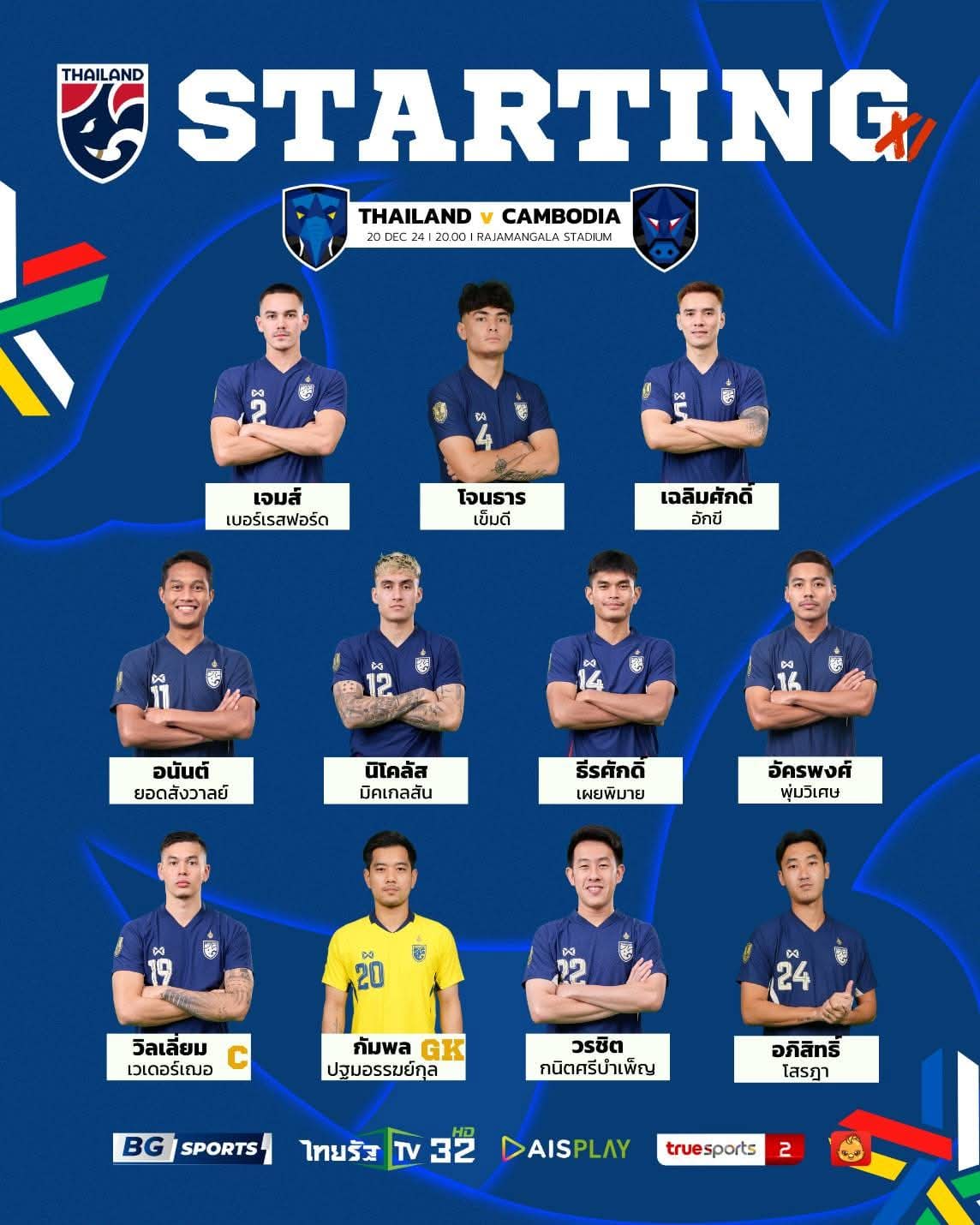 11 ตัวจริง ไทย พบ กัมพูชา ฟุตบอลอาเซียน คัพ 2024 วันที่ 20 ธ.ค. 67 (ลิงก์ดูบอล)