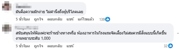 ด้านชาวเน็ตที่ได้อ่านเรื่องราวดังกล่าวต่างก็พากันเข้ามาแสดงความคิดเห็นกันอย่างมากมาย โดยส่วนใหญ่ต่างวิจารณ์การบริการของโรงแรมแห่งนี้ที่ใช้ลูกแม็กซ์เย็บอาหารเพื่อตกแต่งจาน ซึ่งเป็นสิ่งที่ไม่สมควร และเชฟทุกคนควรรู้อยู่แล้วว่าทุกสิ่งที่อยู่ในจานอาหารจะต้องกินได้ แม้แต่จะเป็นของตกแต่งก็ตาม ทั้งยังแนะนำให้เจ้าของโพสต์ฟ้องโรงแรมนี้ และไปเขียนรีวิวใน Google maps เพื่อเตือนลูกค้าท่านอื่น ๆ ให้ระวัง และแก้เผ็ดโรงแรมให้ออกมารับผิดชอบเรื่องนี้ด้วย